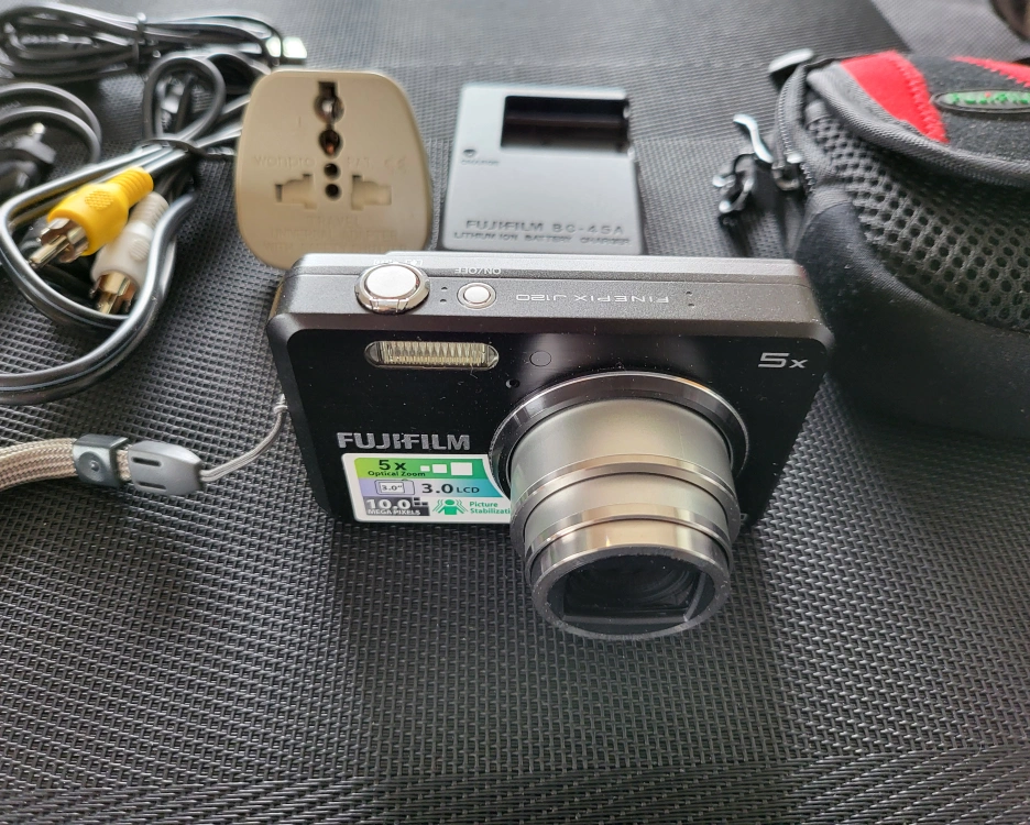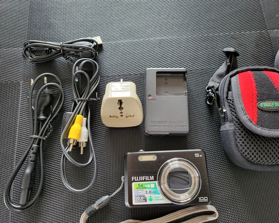 Accessories include: NP-45 rechargeable battery, battery charger with power cable, A/V cable, USB cable, carrying case.