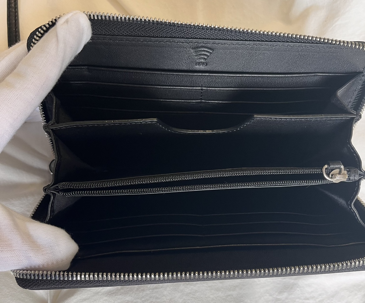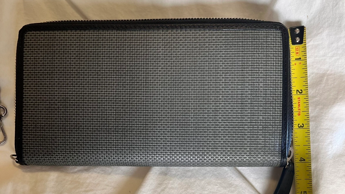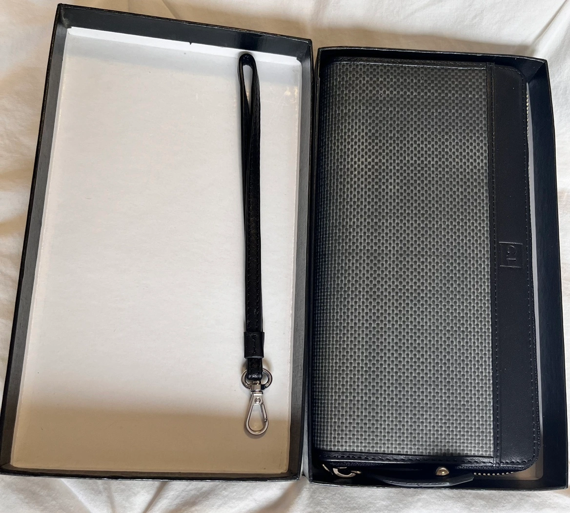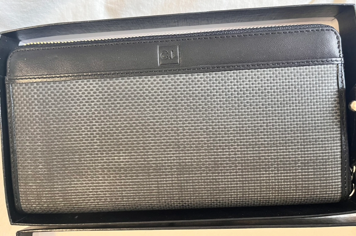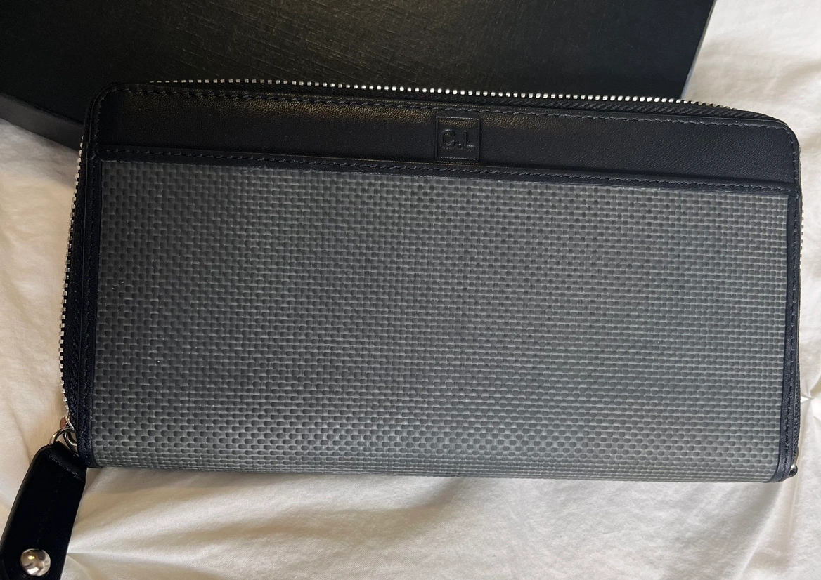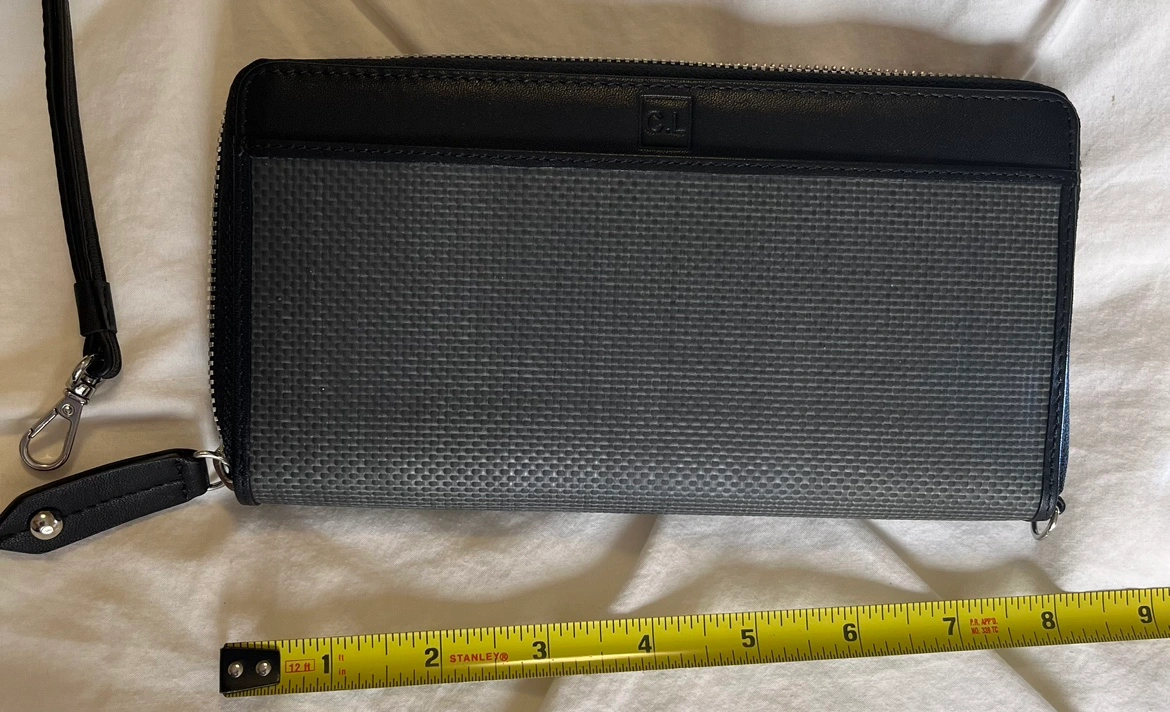 Brand New Black and grey Leather wallet with zip closure with inside RFID pocket for protection of personal data and detachable wrist strap.. Comes in original box.