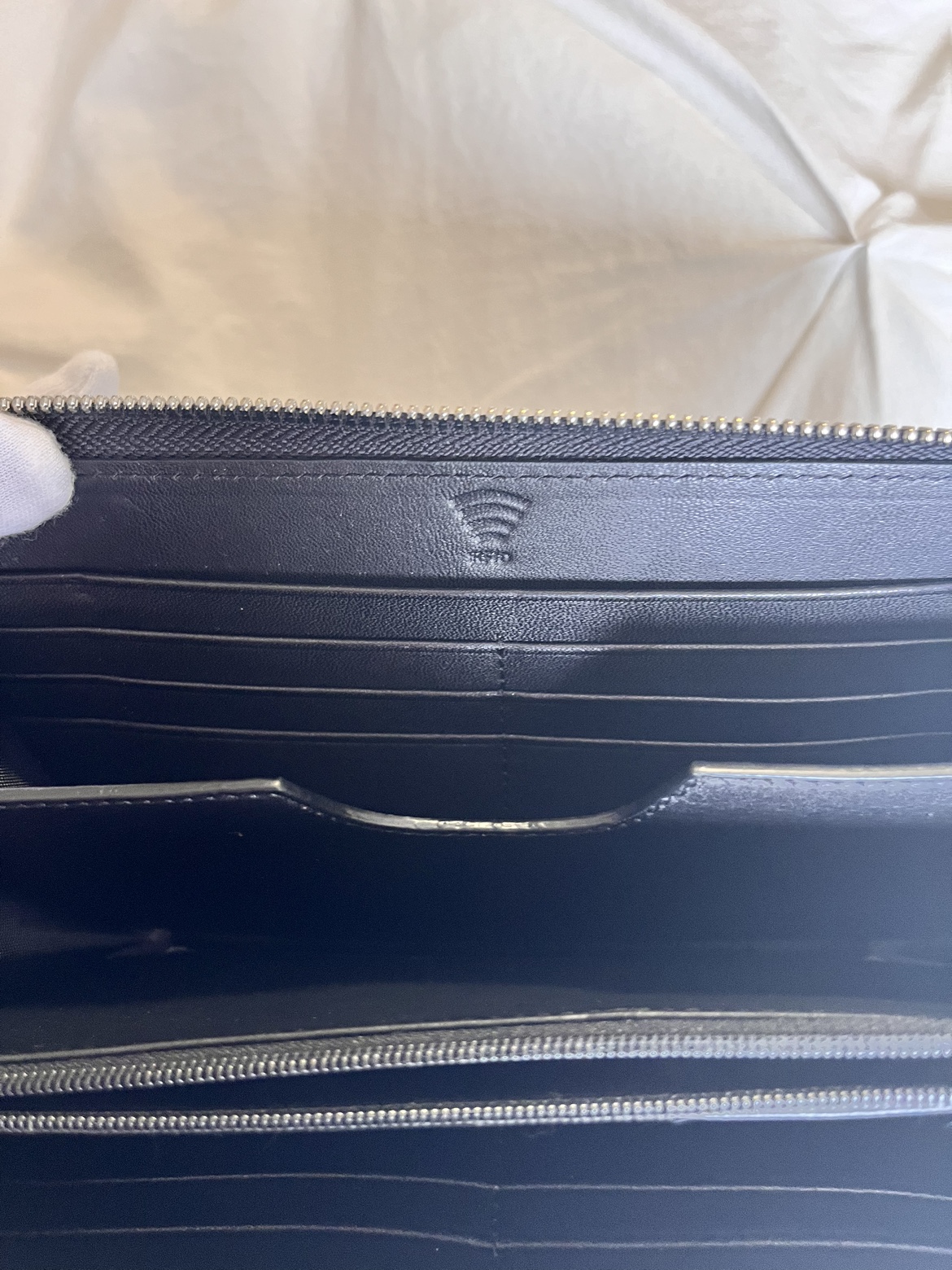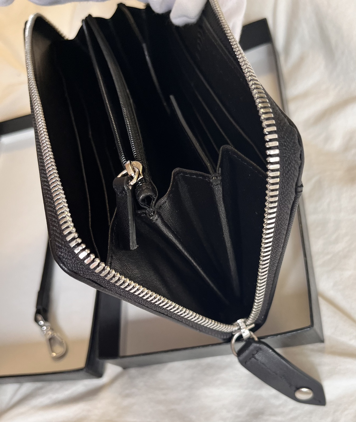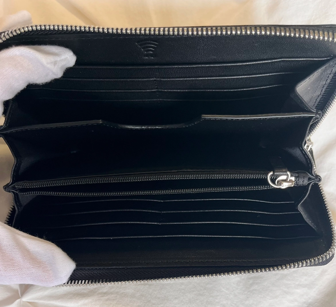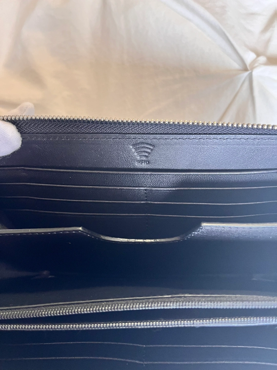 Brand New Black and grey Leather wallet with zip closure with inside RFID pocket for protection of personal data and detachable wrist strap.. Comes in original box.