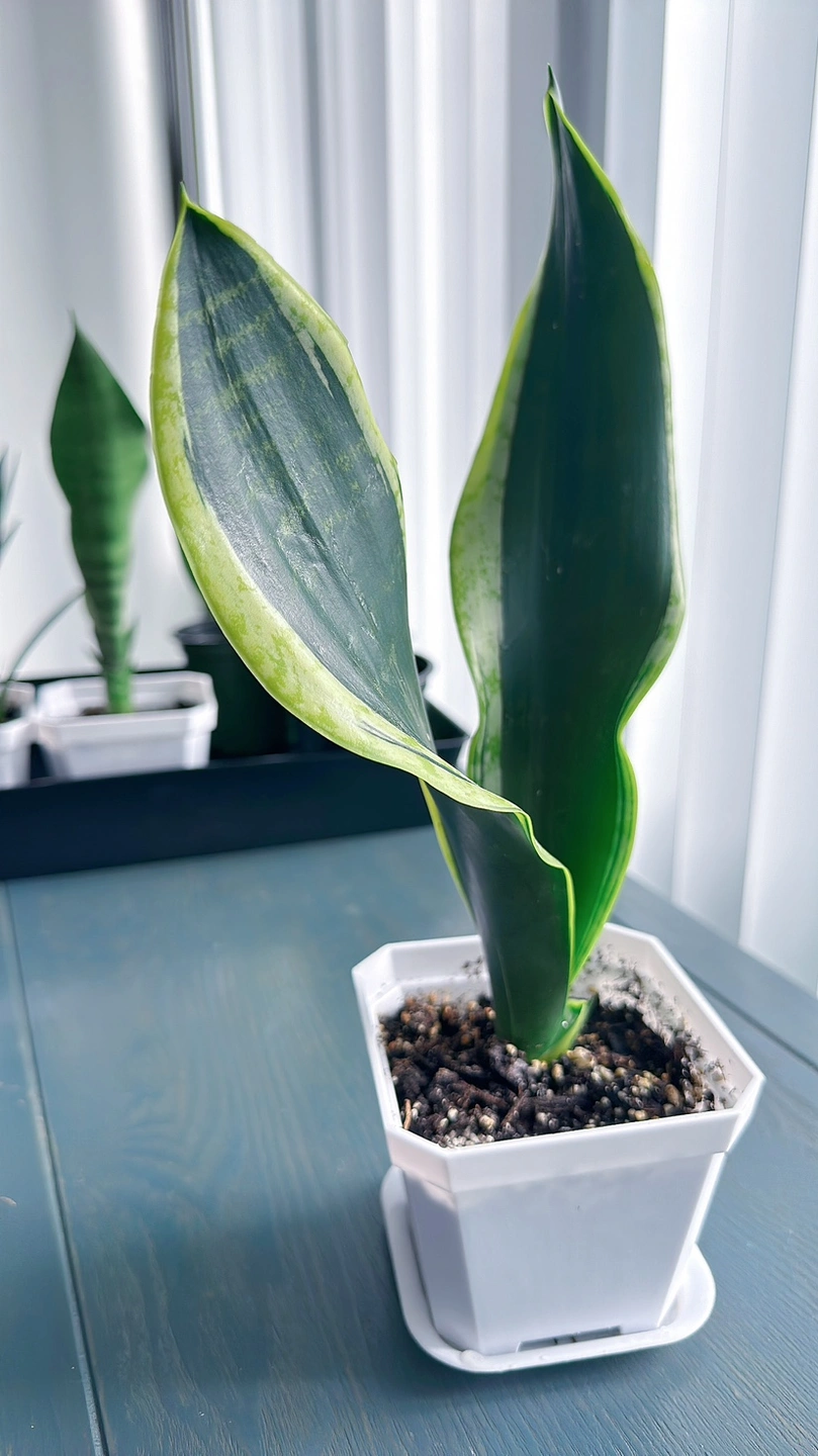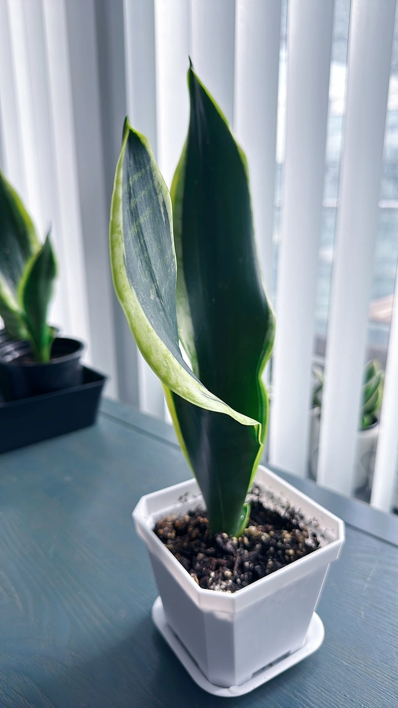 Healthy Snake plant in a 4 inch pot. The plant is approximately 13 inches tall. The plant is easy to care for and will thrive in a variety of conditions.