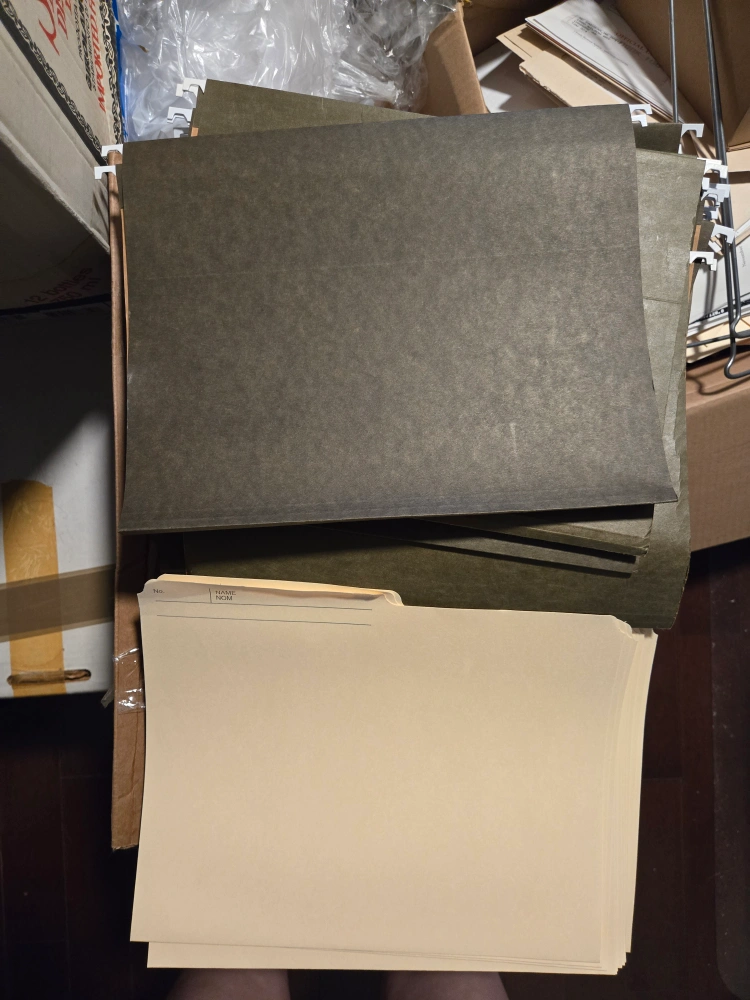 A stack of hanging file folders and regular File Folders. About 20 of each. giving away since no longer needed.