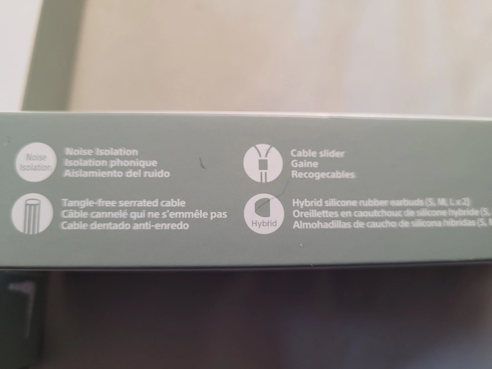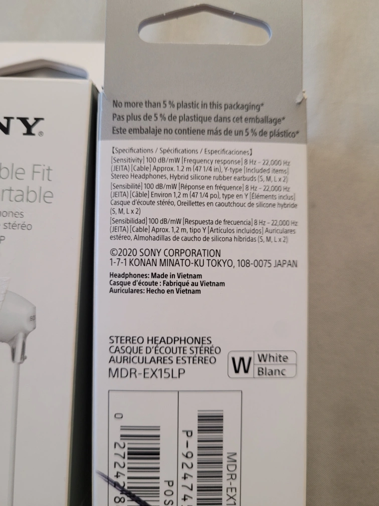 Sony White stereo headphones with a cable slider and a tangle-free cable. Includes multiple earbud sizes. Comes with the original box. 15 pair for the price of 25, all new some open box.