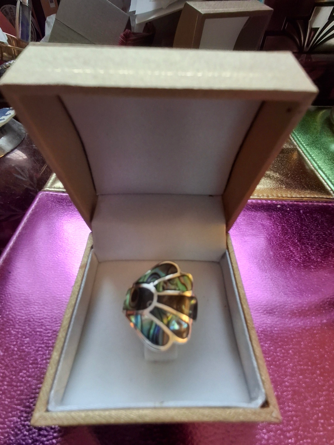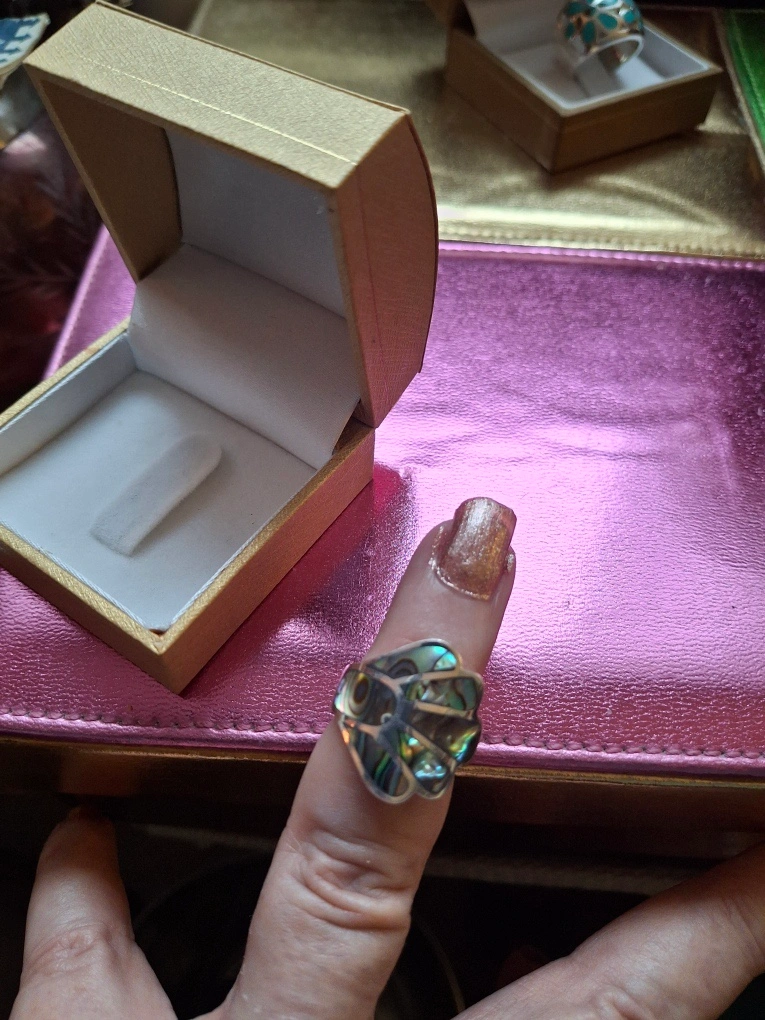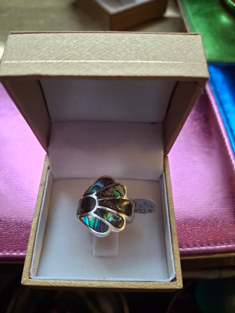 1000+Abalone ring, size 5 3/4. Silver, stamped 925 inside. Never worn, tag still on. Comes in ring box. Available for pickup in Markland Wood.