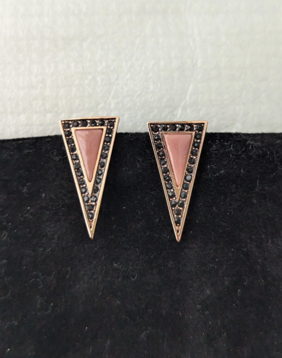 Rose gold earrings with black rhinestones and a rose quartz centre. Comes with original pouch. Never worn.