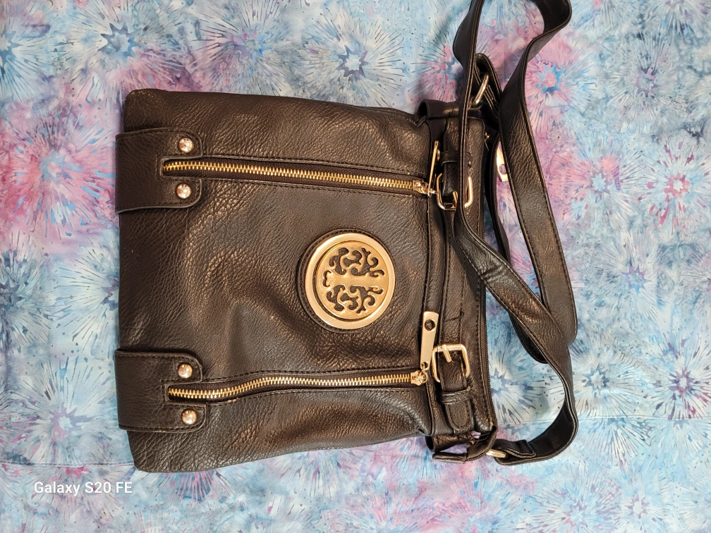 This bag features a black leatherette exterior with a gold circular design on the front. The bag has a zippered main compartment, a zippered pocket on the back, and a long adjustable strap.