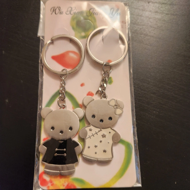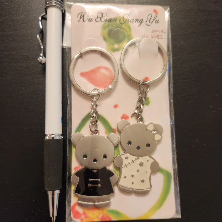 269A set of two keychains featuring a cute couple of bears in traditional outfits. They are silver in colour and come on a silver chain with a silver ring for attaching to a keychain. The pen in the second image is for size comparison only.