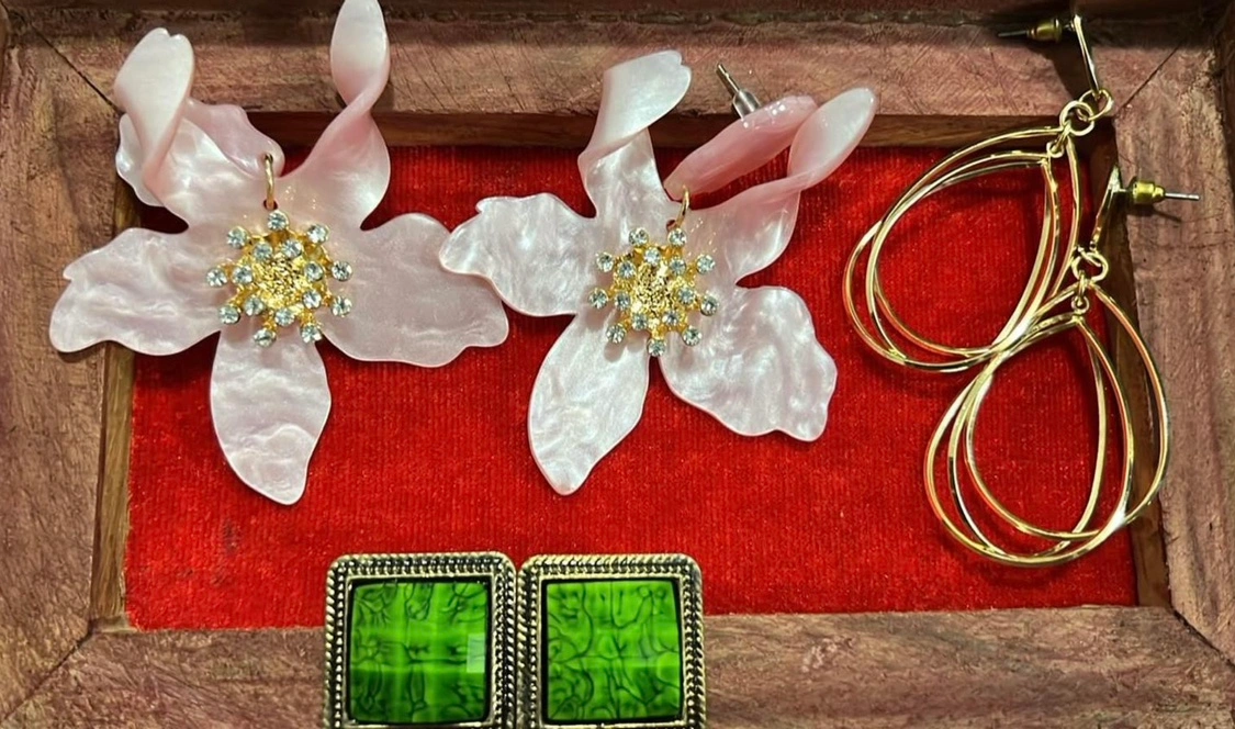 This set of earrings features a pair of flower-shaped earrings and a pair of gold hoop earrings.