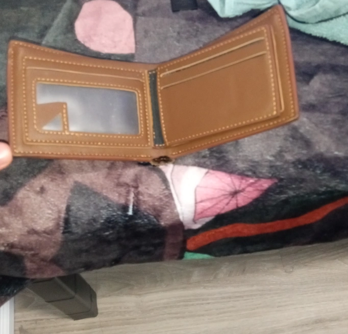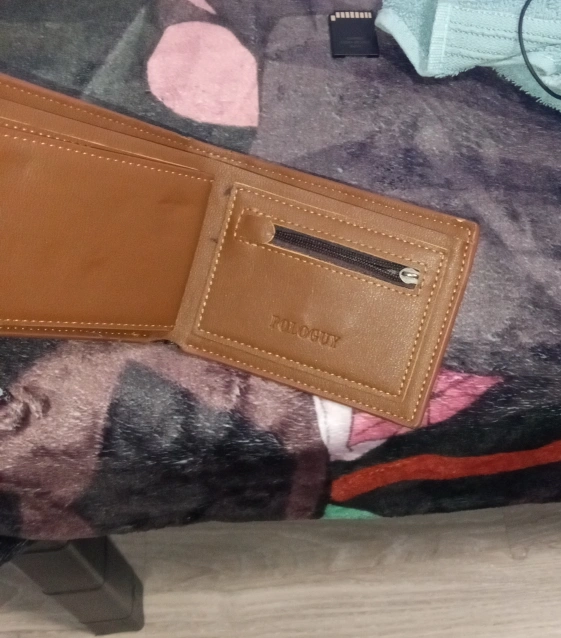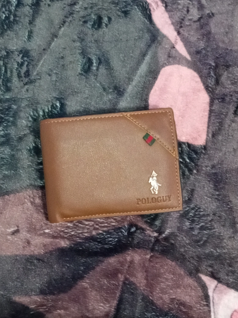 A brown leather wallet with a zippered pocket and a clear ID window. It also has a small logo on the front and "POLOGUY" on the inside.