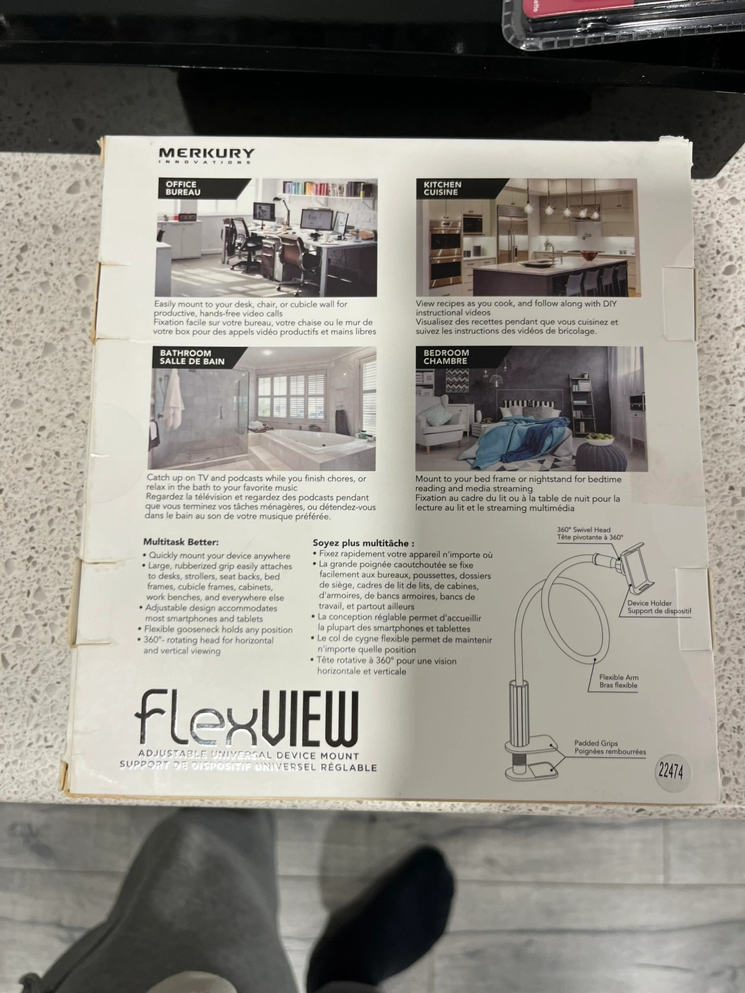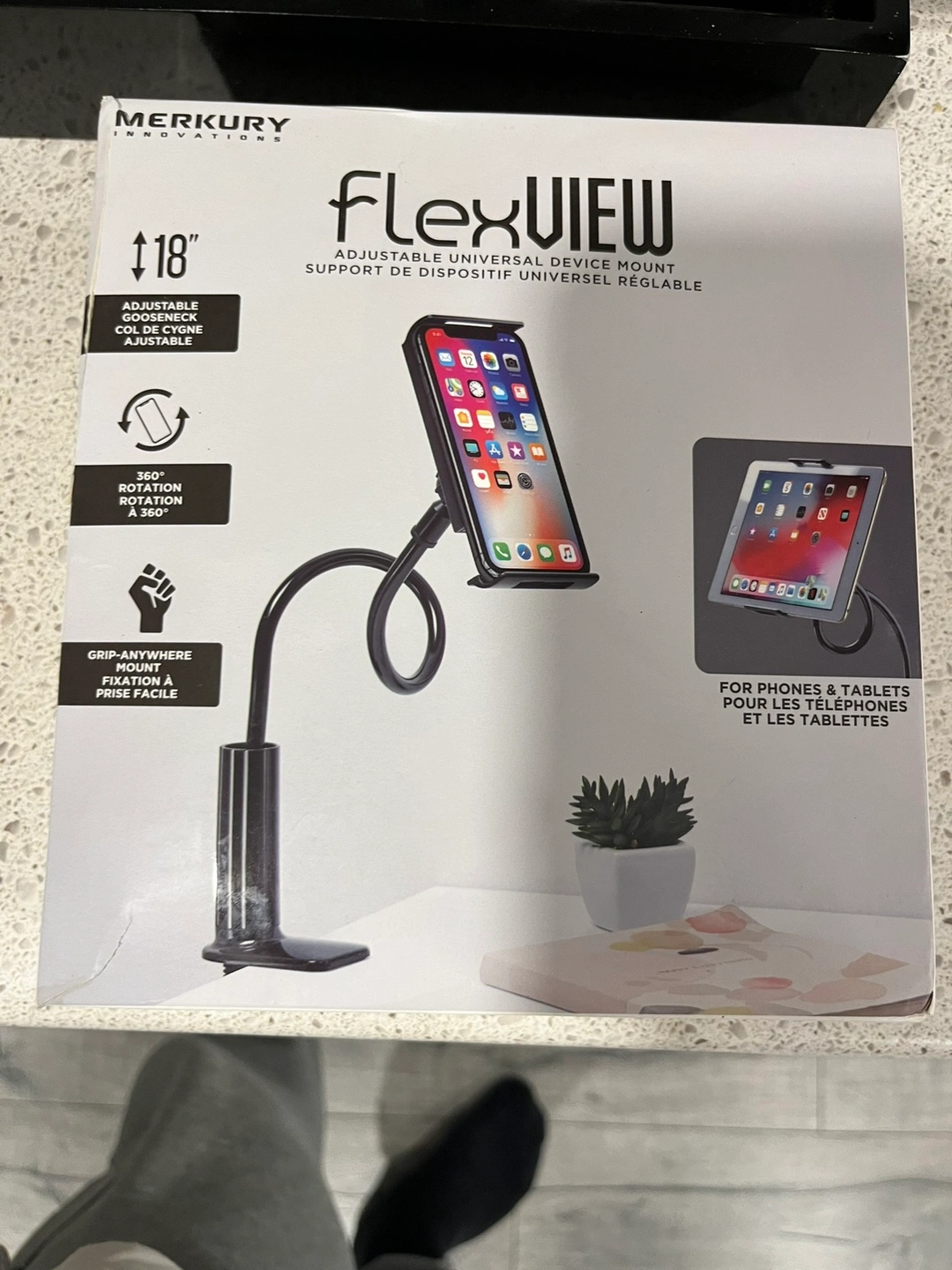 A universal phone and tablet stand with a flexible arm and adjustable grip for mounting on a variety of surfaces.