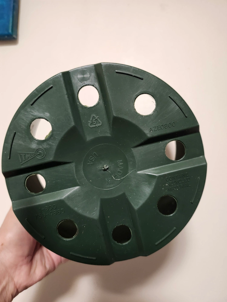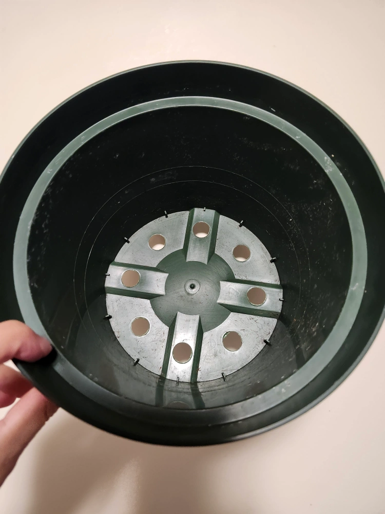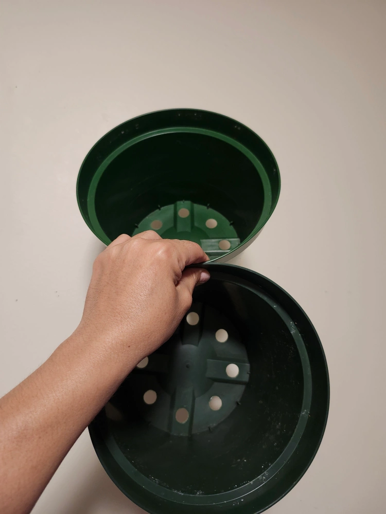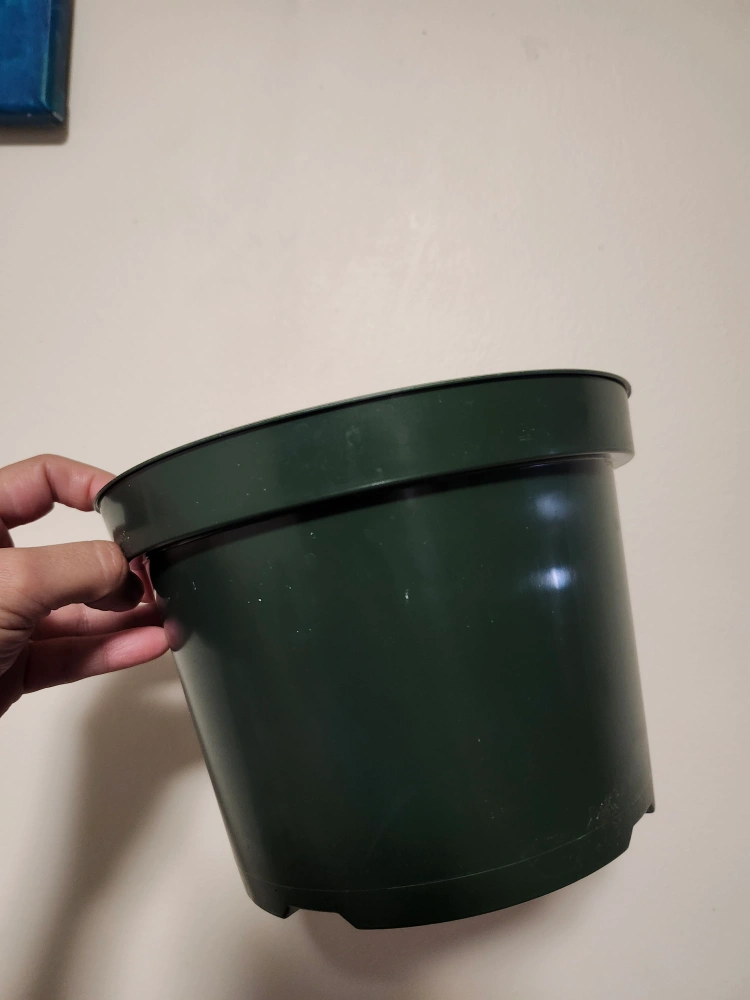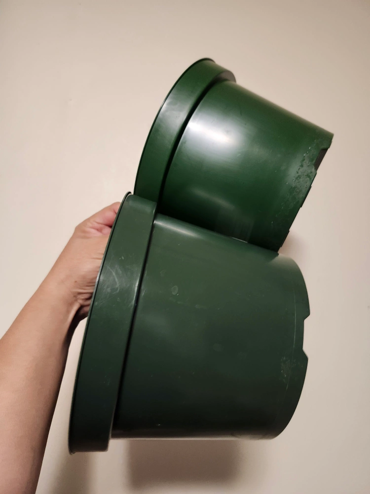 Set of two green plastic plant pots. The pots are the same size. both pots are 10 inches tall. Both have drainage holes in the bottom. They are in good condition.