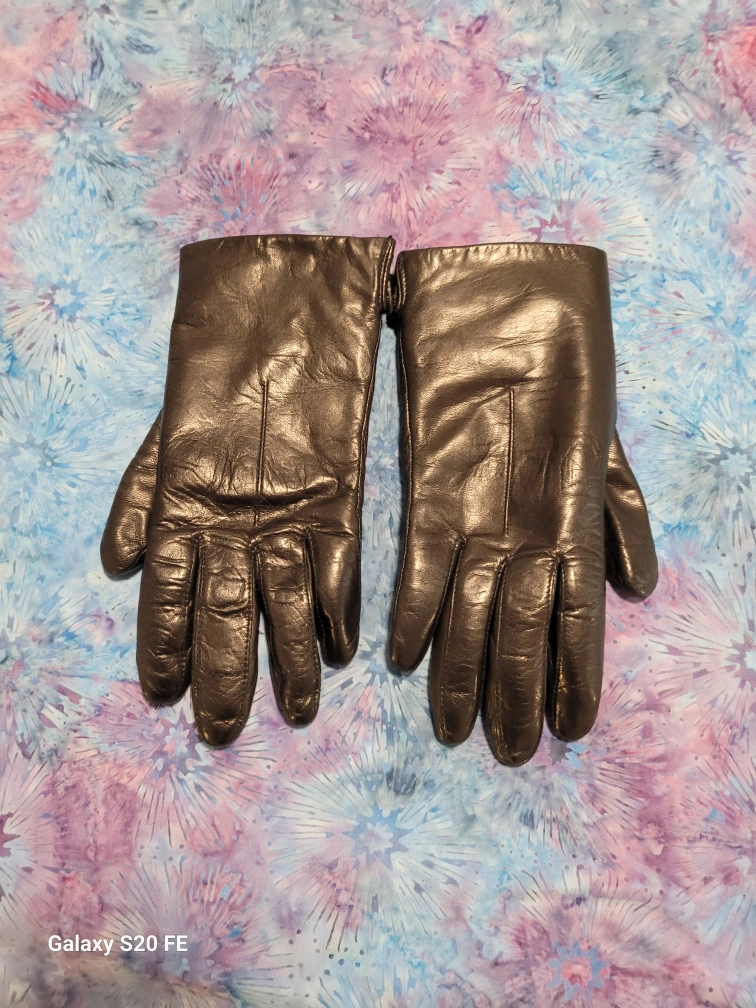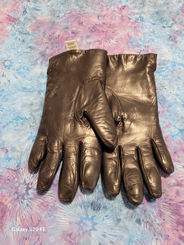 These are stylish and comfortable black leather gloves. They feature a soft fur lining for warmth. They have a subtle detail of a chevron pattern on the back of the hand.