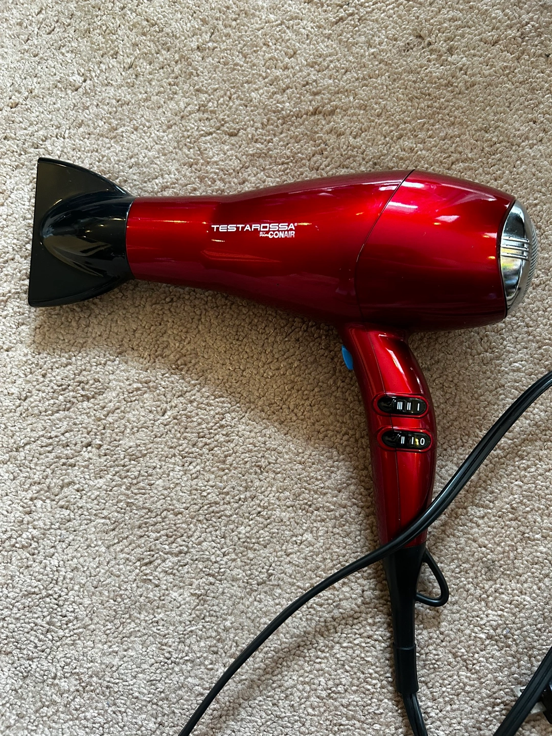 Red Conair Testarossa Hair Dryer with multiple heat and speed settings. Includes concentrator but missing diffuser piece.