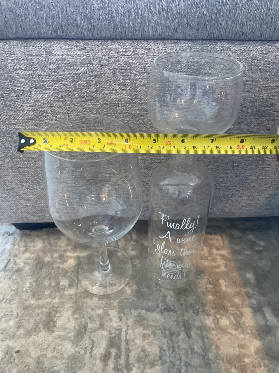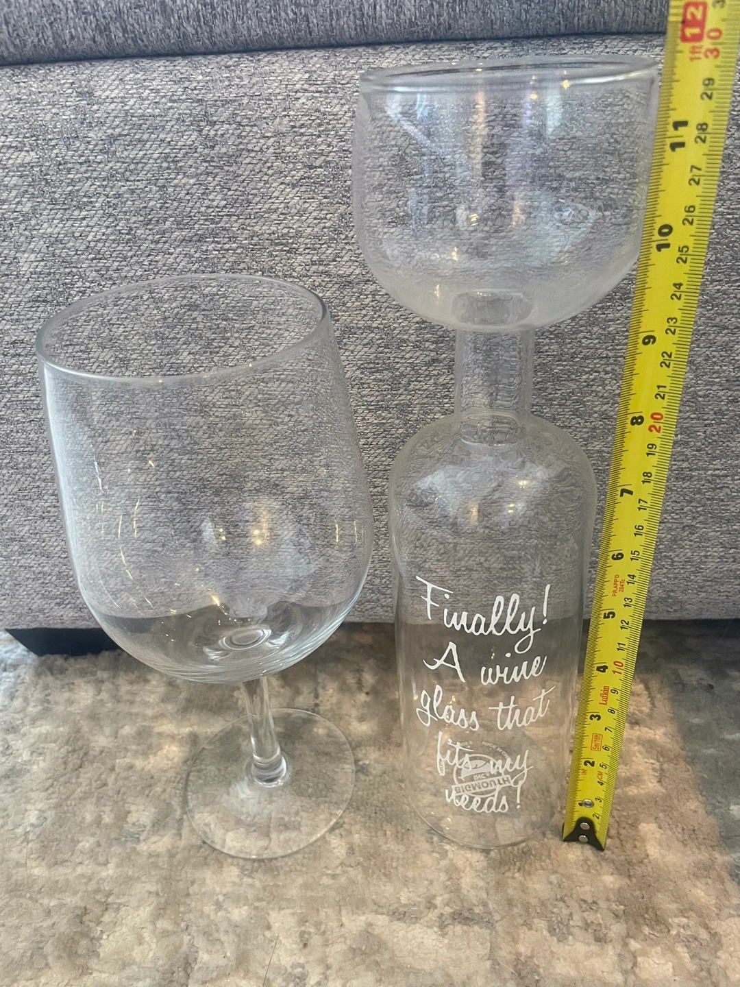 This set includes a super size wine glass that holds an entire bottle and a novelty wine glass that is shaped like a wine bottle. The novelty wine glass has the saying "Finally! A wine glass that fits my needs!" on it.