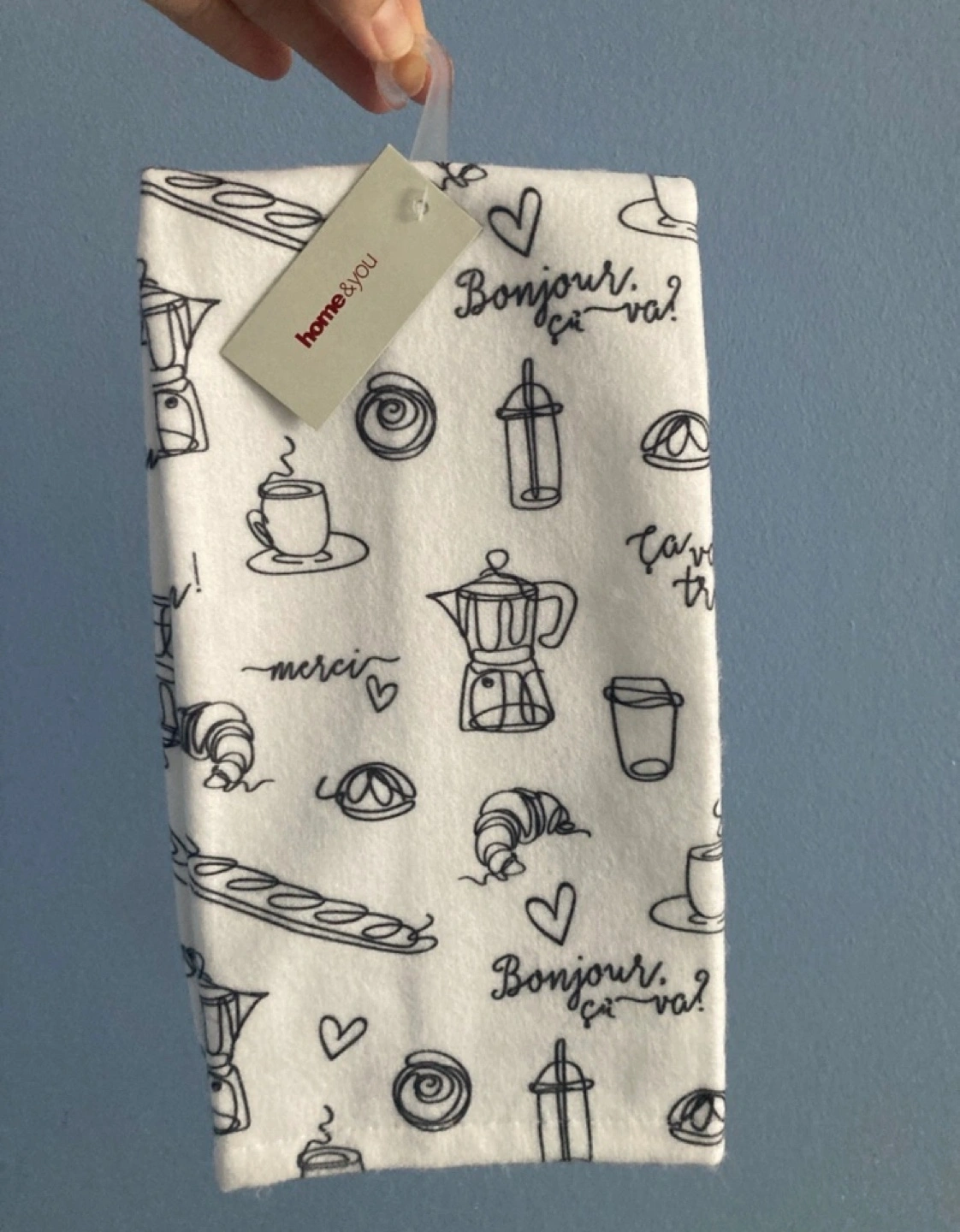 Brand new with tags and giftable kitchen cloth from Poland. Soft. White with coffee + French designs on it. Super cute. Pickup Mississauga by Hurontario and Dundas. Cash only.