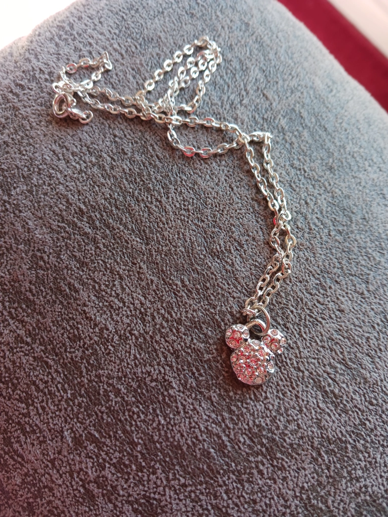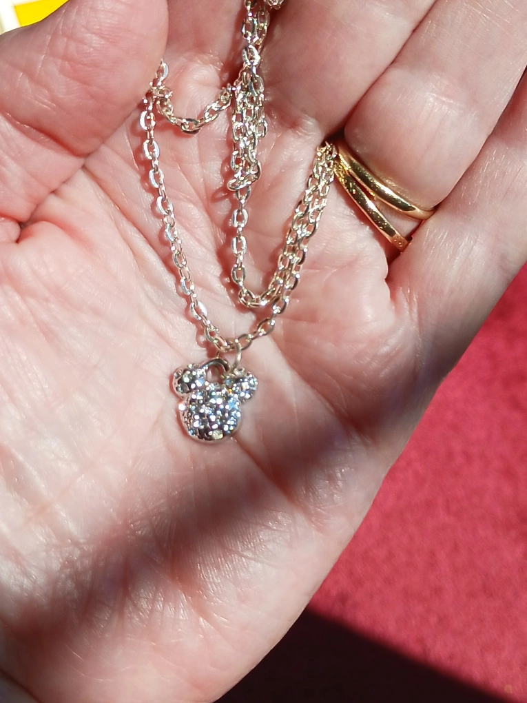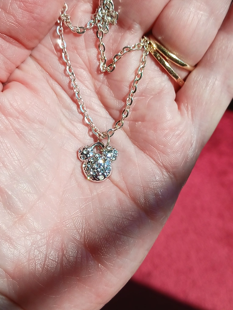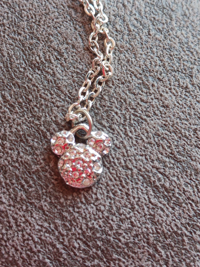 A silver necklace with a Mickey Mouse charm that is covered in rhinestones.
