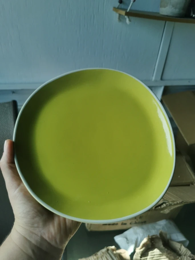 A bright green dinner plate from Beja Home. The plate has a white rim.
