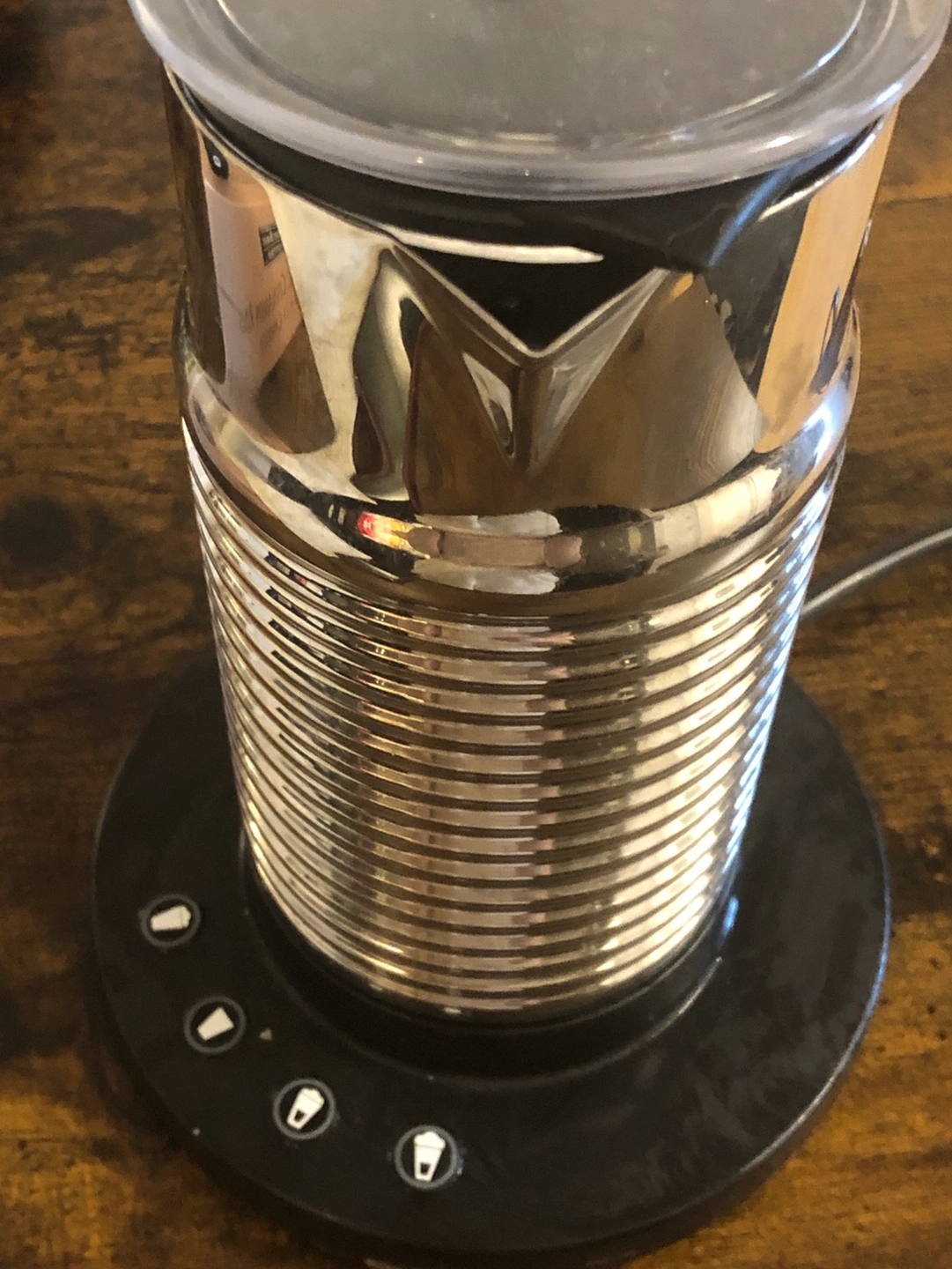Electric milk frother with a stainless steel base.