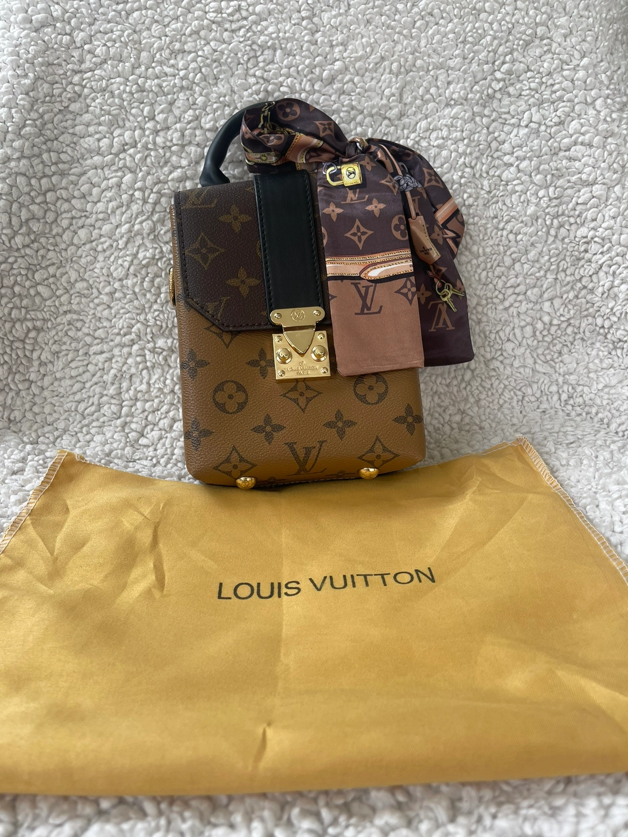 High quality luxury inspired Small brown and black handbag,adjustable shoulder strap, and a dust bag. Cellphone and small wallet can fit.