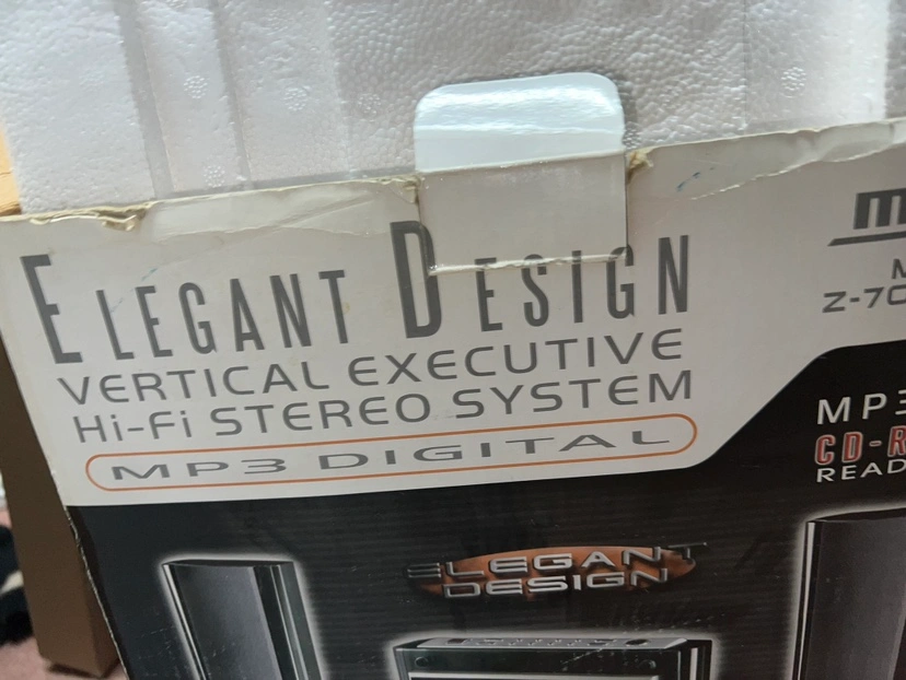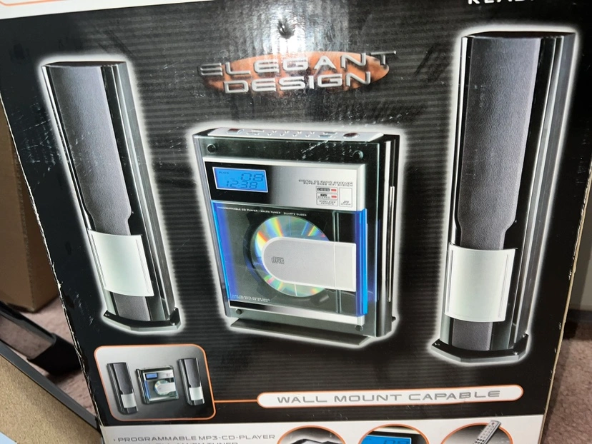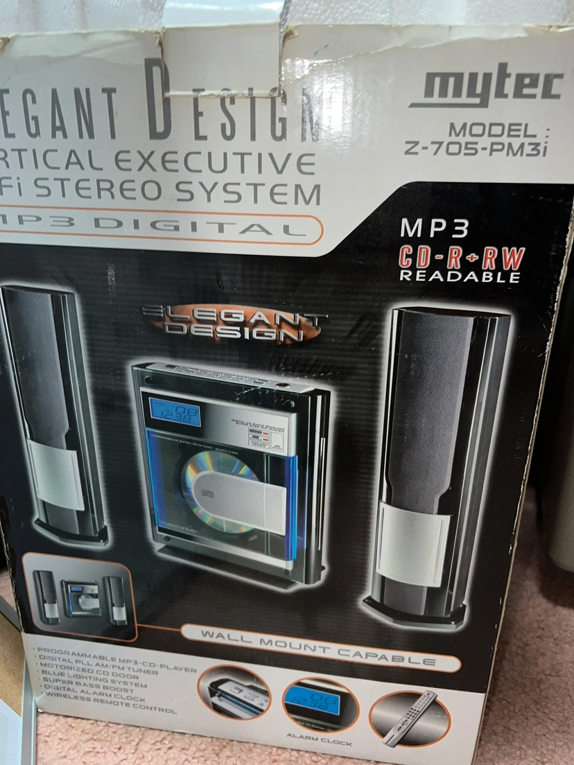 Mytec Z-705-PM31 Vertical Hi-Fi Stereo System MP3 CD-R/RW Readable, wall mount capable. Includes 2 speakers and remote control.