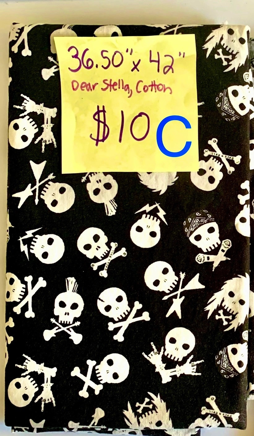 Skulls & bones cotton fabric from Dear Stella. Measures 36.50” x 42”.
