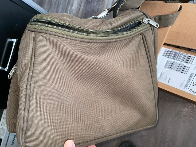 Large green duffle bag with an adjustable strap. There are two zippers on the main compartment, and a zipper on the front with a small storage pouch. The bag has a mesh pocket on the inside. The bottom of the bag is lined with a thicker material.