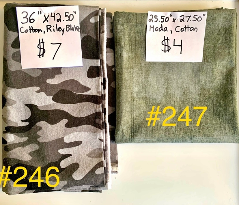 Grey camo cotton fabric by Riley Blake measures 36” x 42.50” - $7.00.