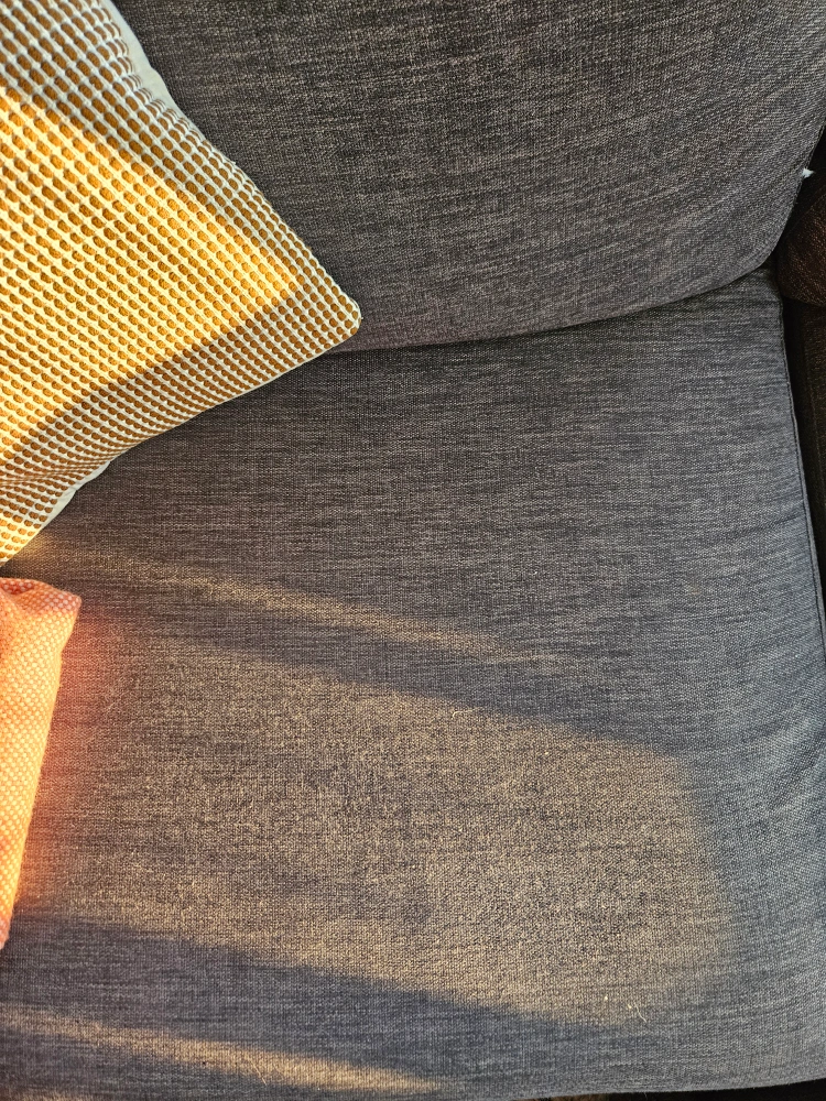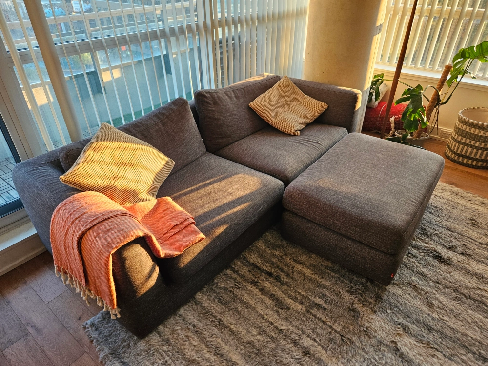 Plush EQ3 sofa for sale with matching loose Ottoman. Colour is 'Key Largo Anthracite', a Grade 20 upgraded fabric. Retail price was $3500 for the set. Condition is used but good with no major stains or marks - last photo shows a small patch on rear.