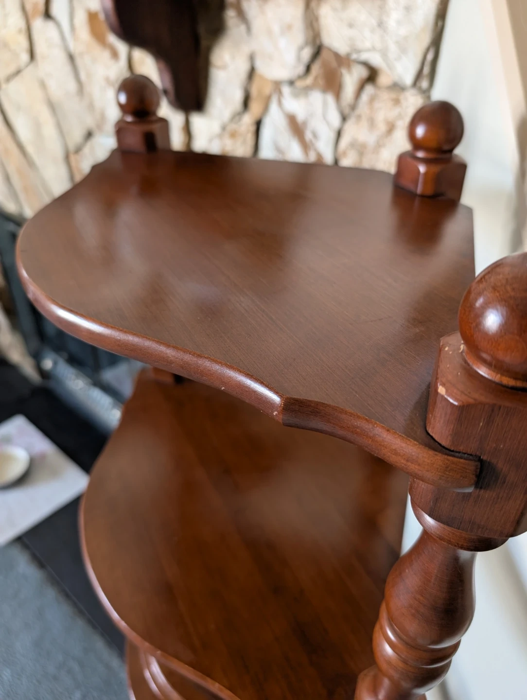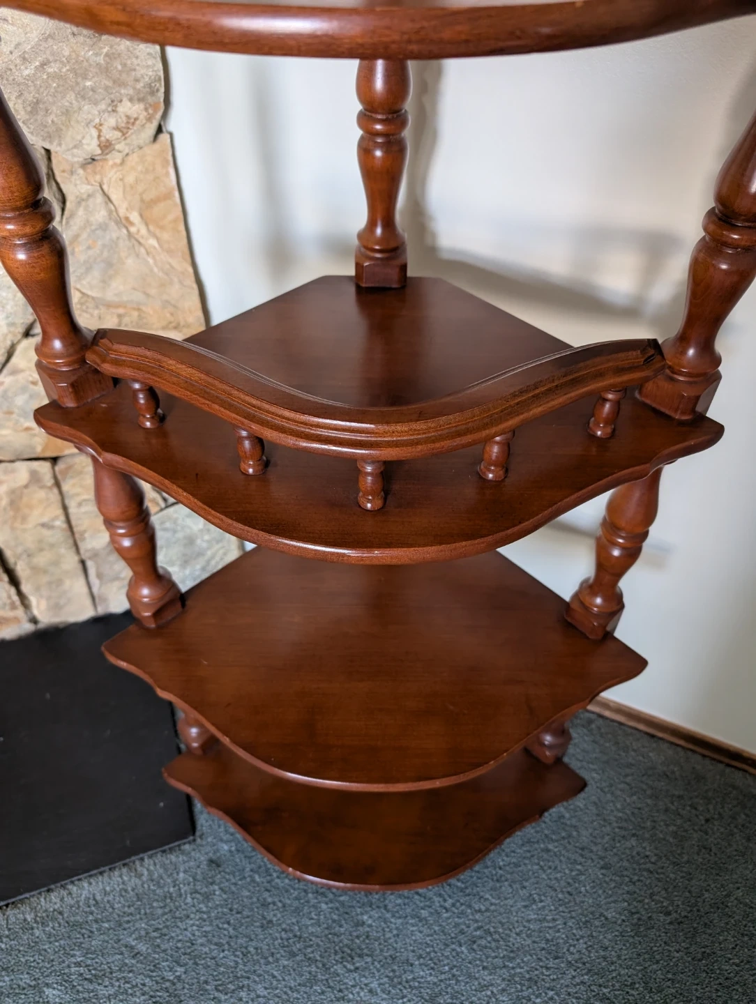 This is a classic vintage wooden 5 tier corner shelf unit. It's made of solid wood with a rich brown finish. It has five tiered shelves, perfect for displaying plants or decor. Decorative. Ornate spindles. Very few scratches. Really good condition.