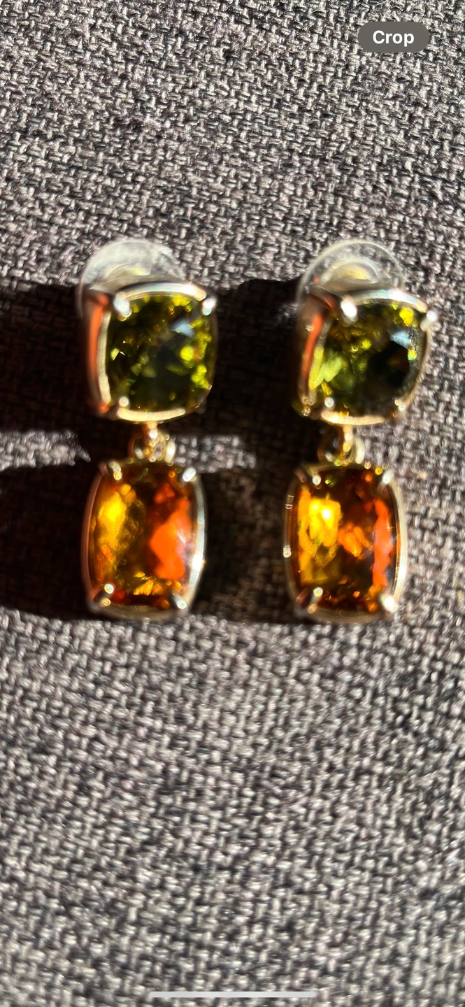 These are Myka brand earrings with green and amber stone accents. They have a gold tone finish. They are post style with a push-back closure.