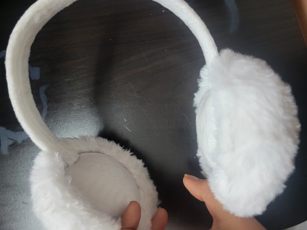 These earmuffs are white and furry. They have a headband that goes over your head. They are perfect for keeping your ears warm in the winter.