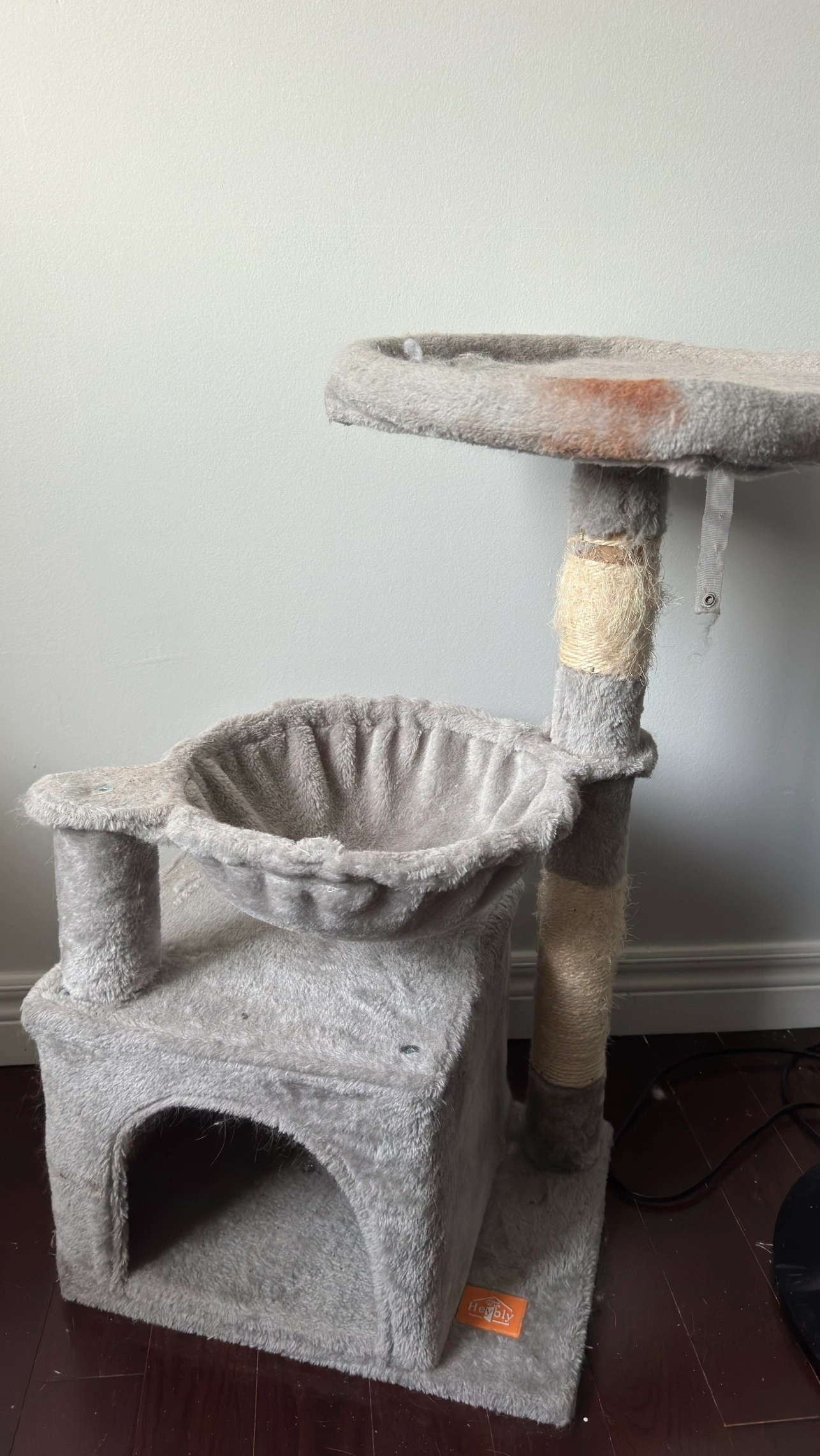 A grey cat tree with a top platform, a hammock and a small enclosed space. It has one scratching post covered in sisal rope. It has a couple stains and not in a new condition.