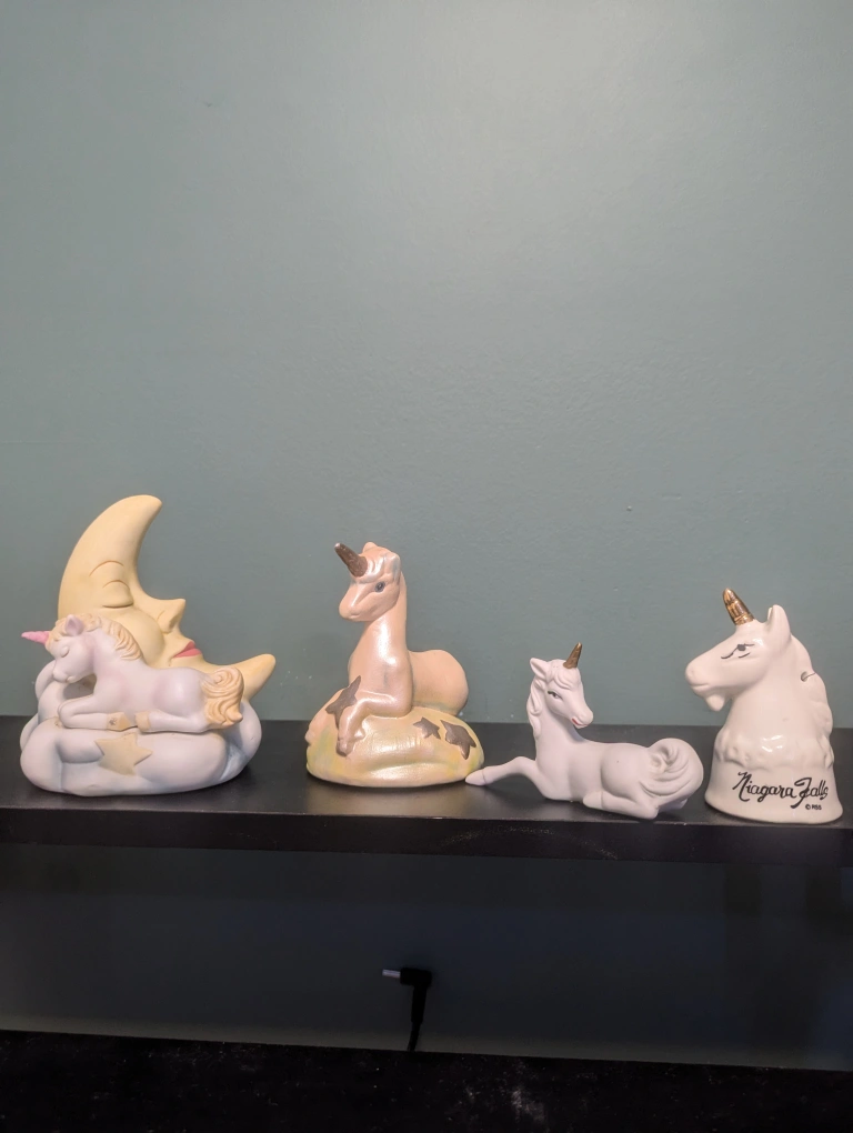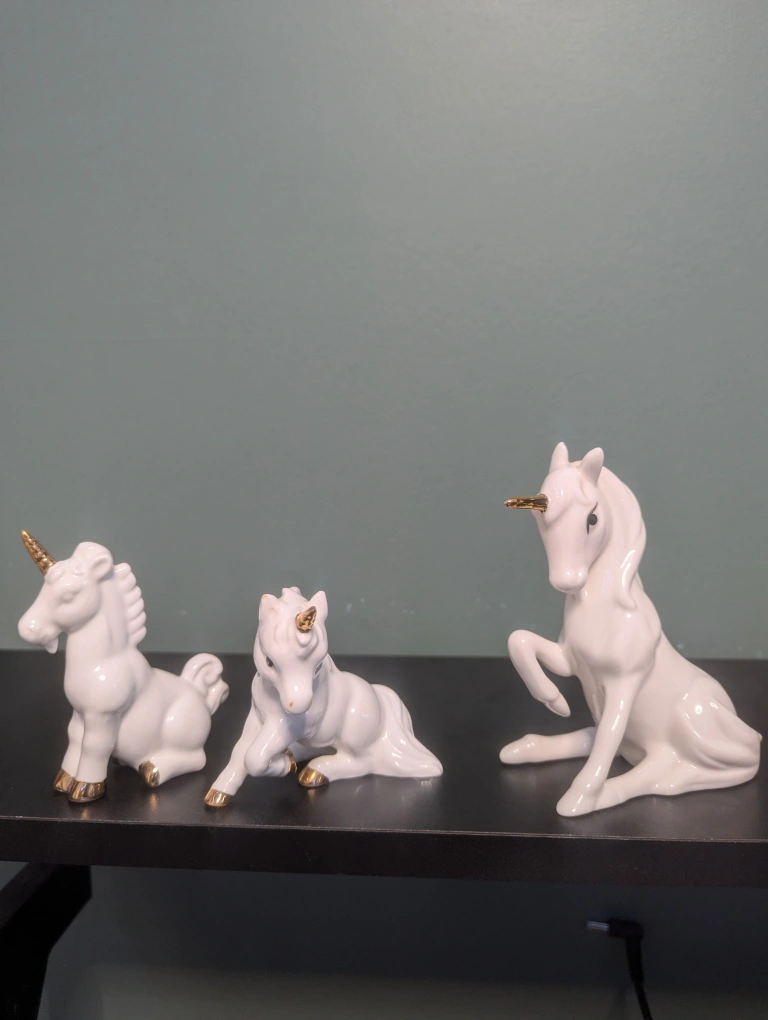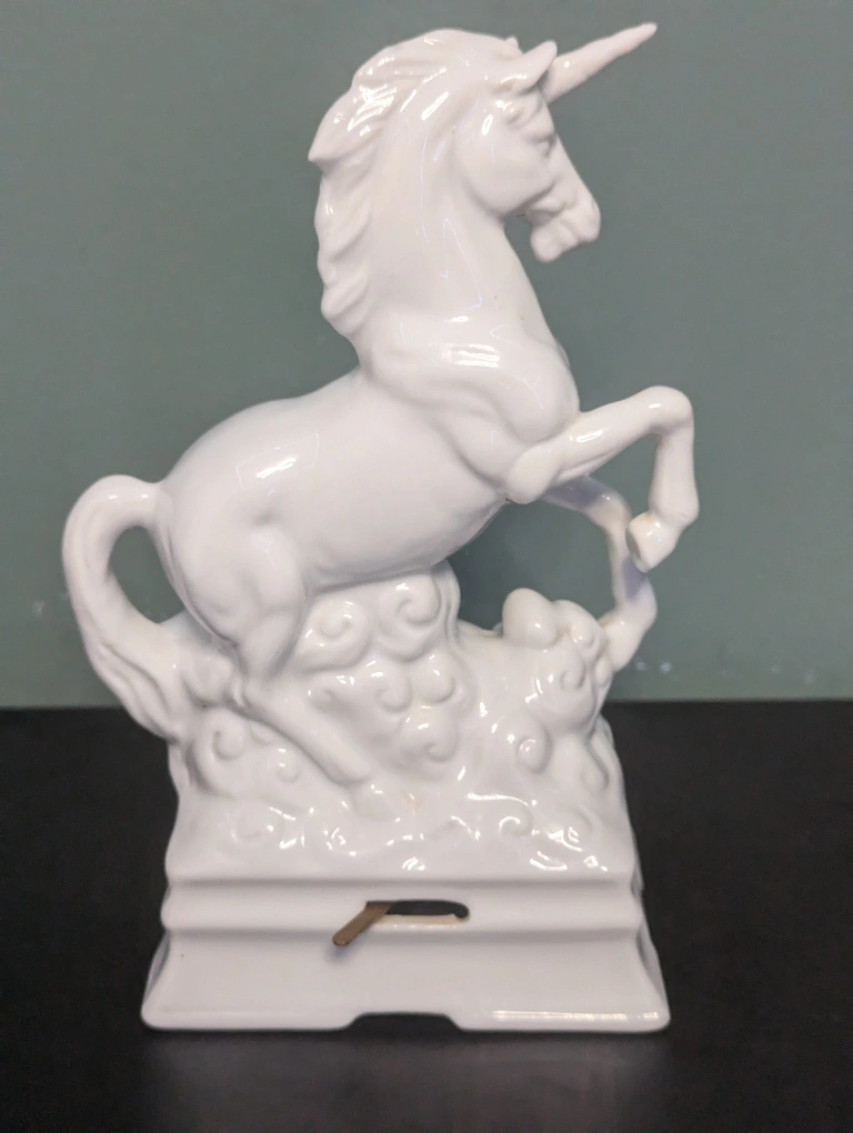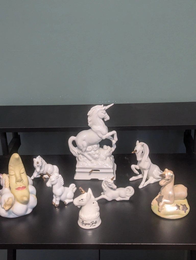 Set of 8 Unicorn Figurines. One of the figurines is a music box marked "Otagiri, Japan, 1981" and stands 8 inches tall. The set also includes a unicorn head bell. A charming collection of unicorn statuettes and figurines (8 pieces).