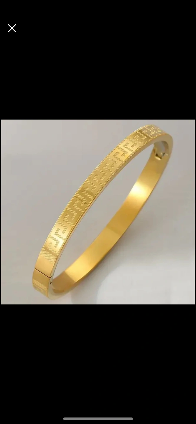 A gold bangle bracelet. It has a patterned design on the top and a smooth finish on the bottom.