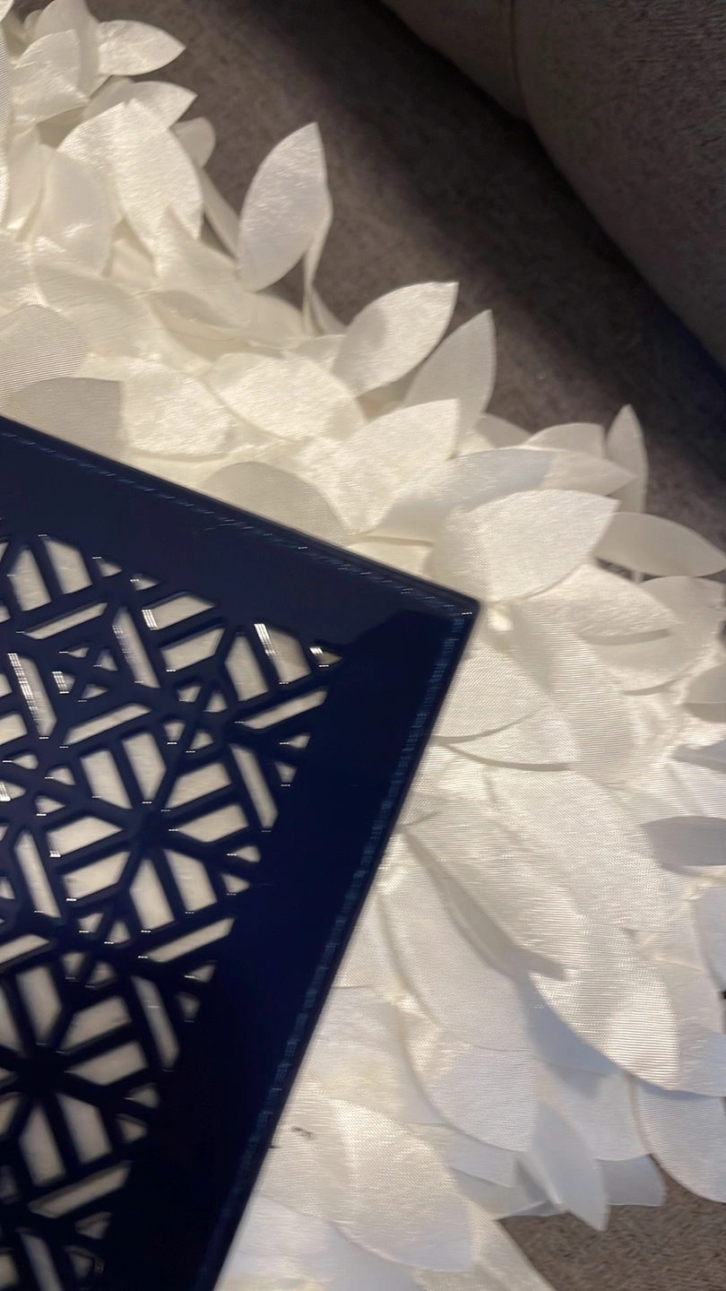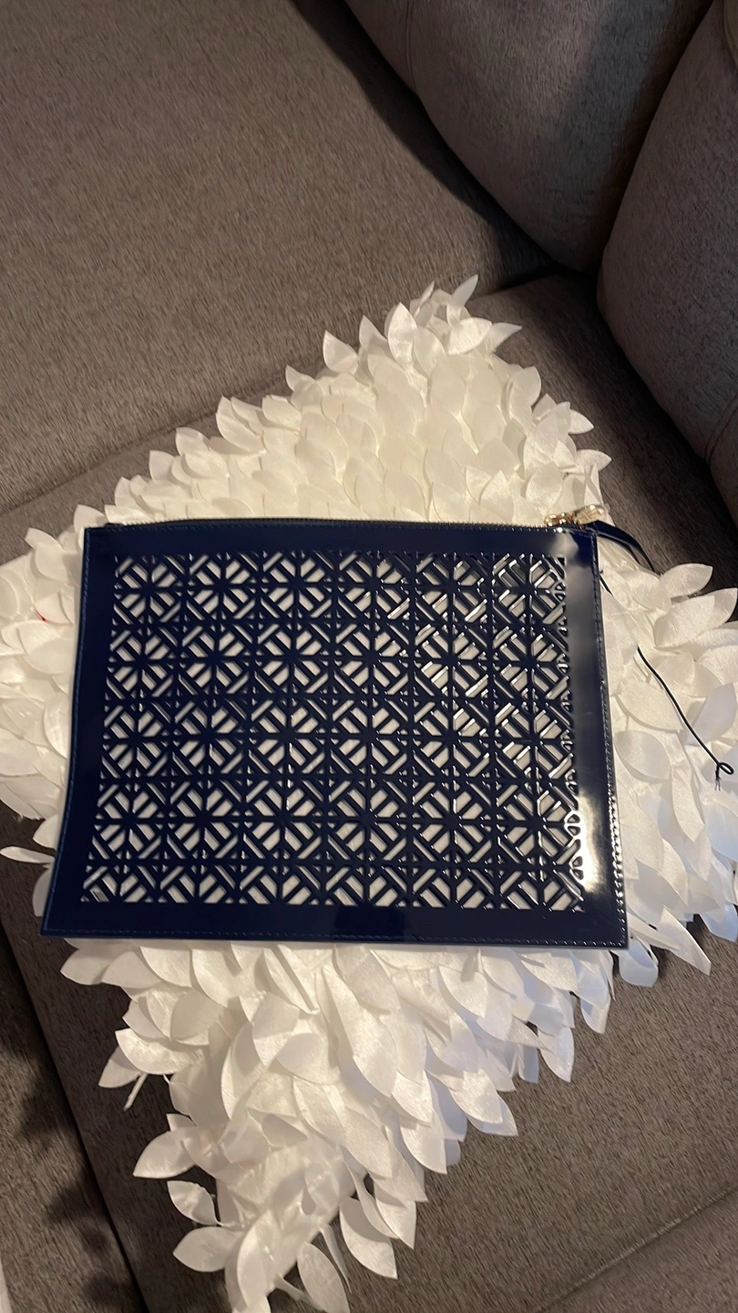 Navy blue clutch with gold hardware and a gold zipper. The clutch is made of a patent leather material and has a geometric cut-out design. It features a wrist strap that is attached to the top of the clutch. The clutch is approximately 11 inches long, 8 inches wide, and 2 inches deep.