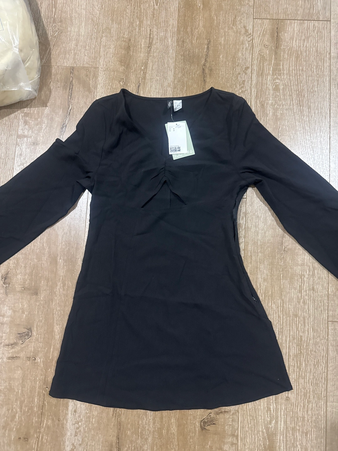 This is a black dress with long sleeves, a round neckline, and a small cutout detail at the chest. The dress is made of a soft, stretchy fabric.