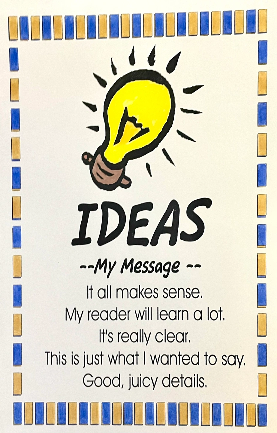 Six Writing Trait colourful posters measuring 11” x 17” for visual clues for kids to remember the writing traits in their writing. Includes: