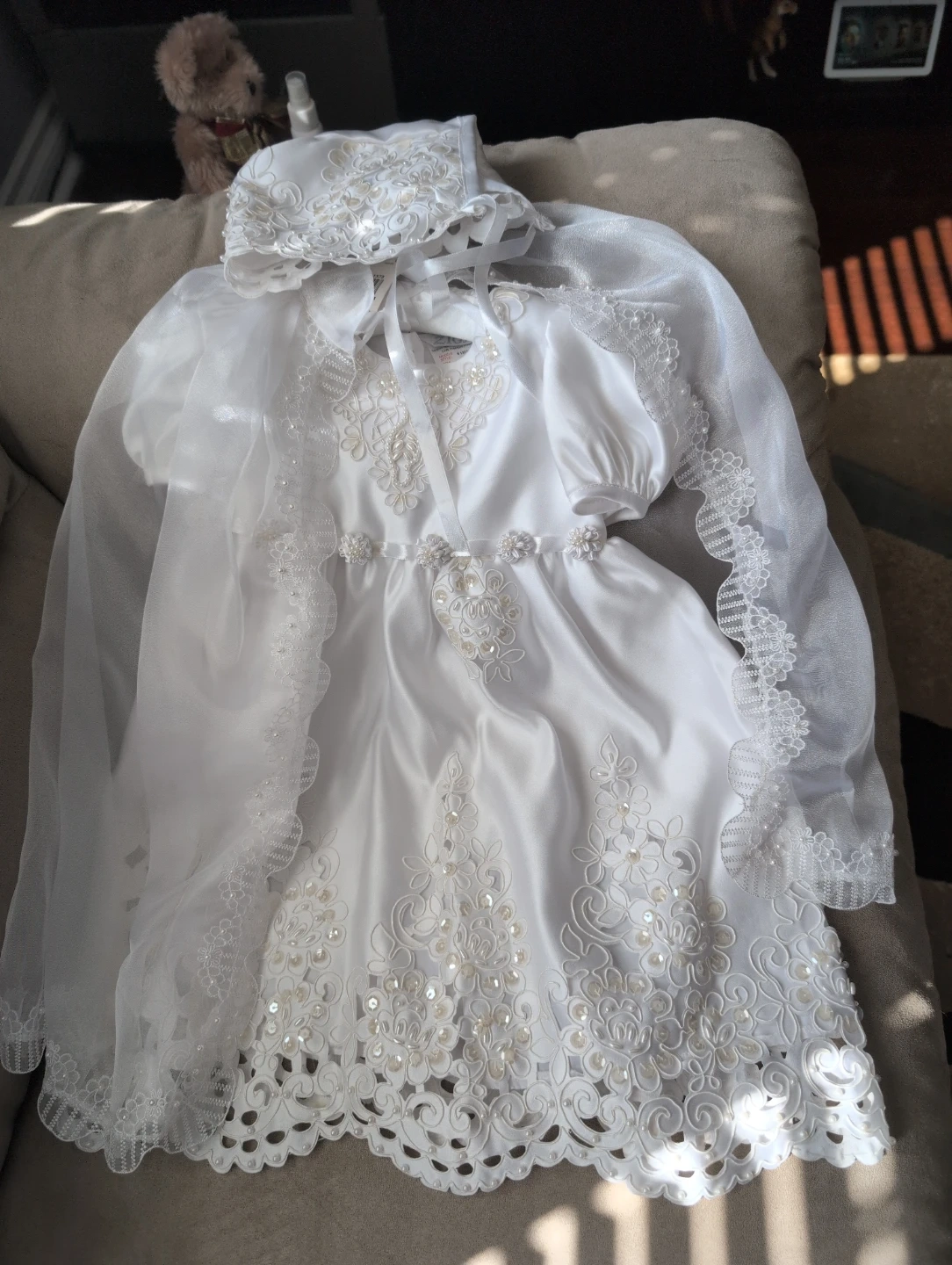 Beautiful white satin christening gown with intricate bead and sequin detailing. Includes a matching bonnet and veil. Perfect for special occasions. With tag never worn as it was too big. Size 3 months.