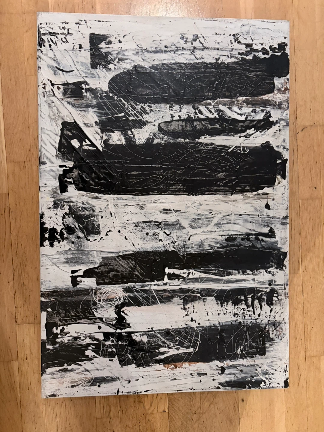 This is an original abstract painting. It features bold black strokes and white textures on a canvas. This piece would add a modern touch to any room!
