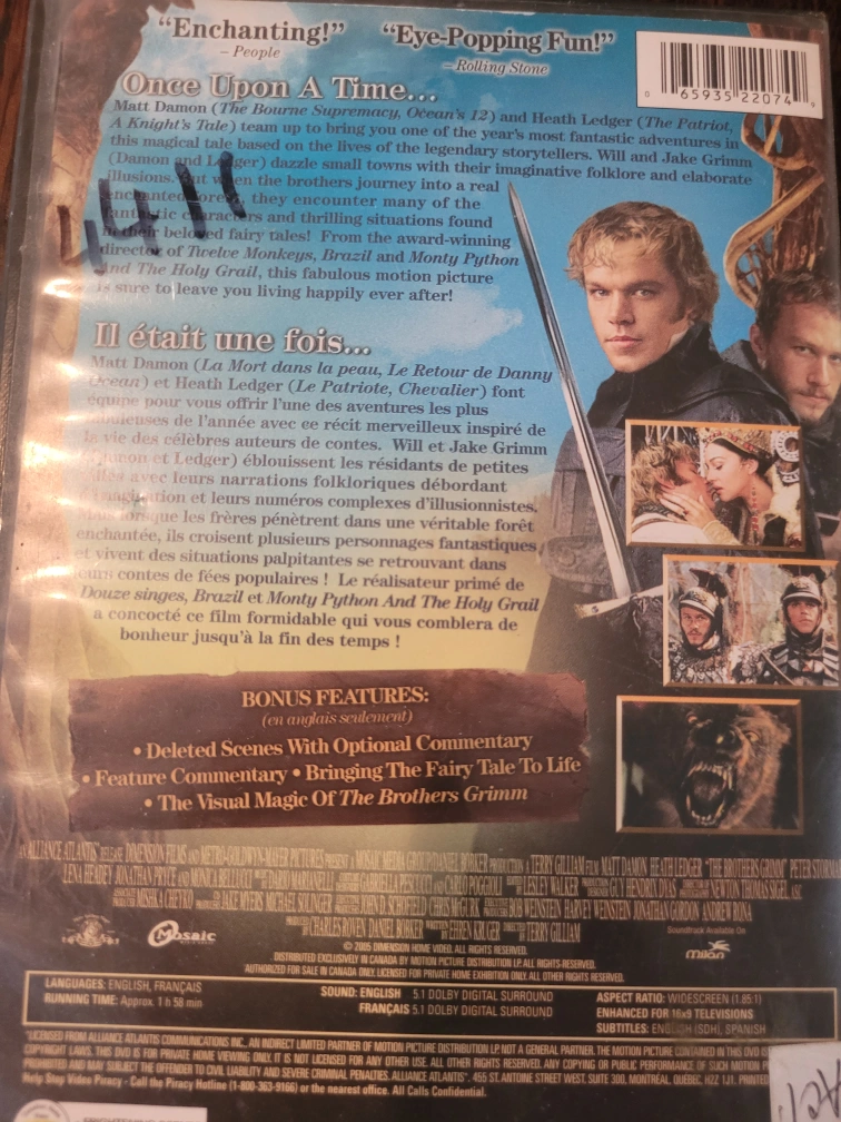 This DVD features Matt Damon, Heath Ledger, and Monica Bellucci. The movie is about two brothers who travel the countryside collecting stories.