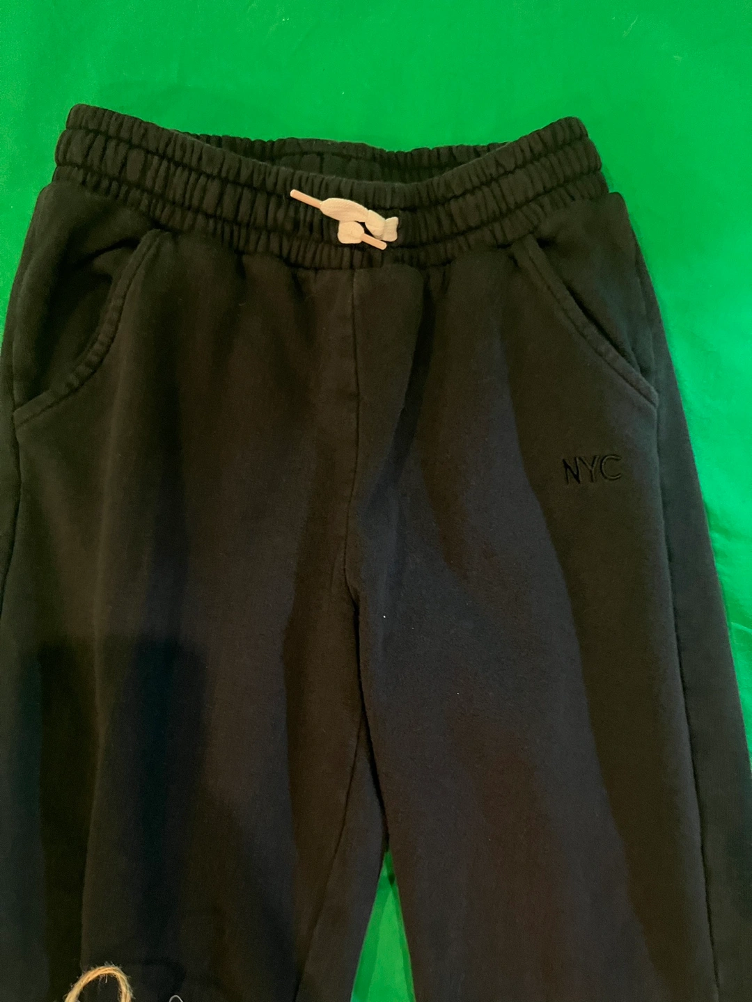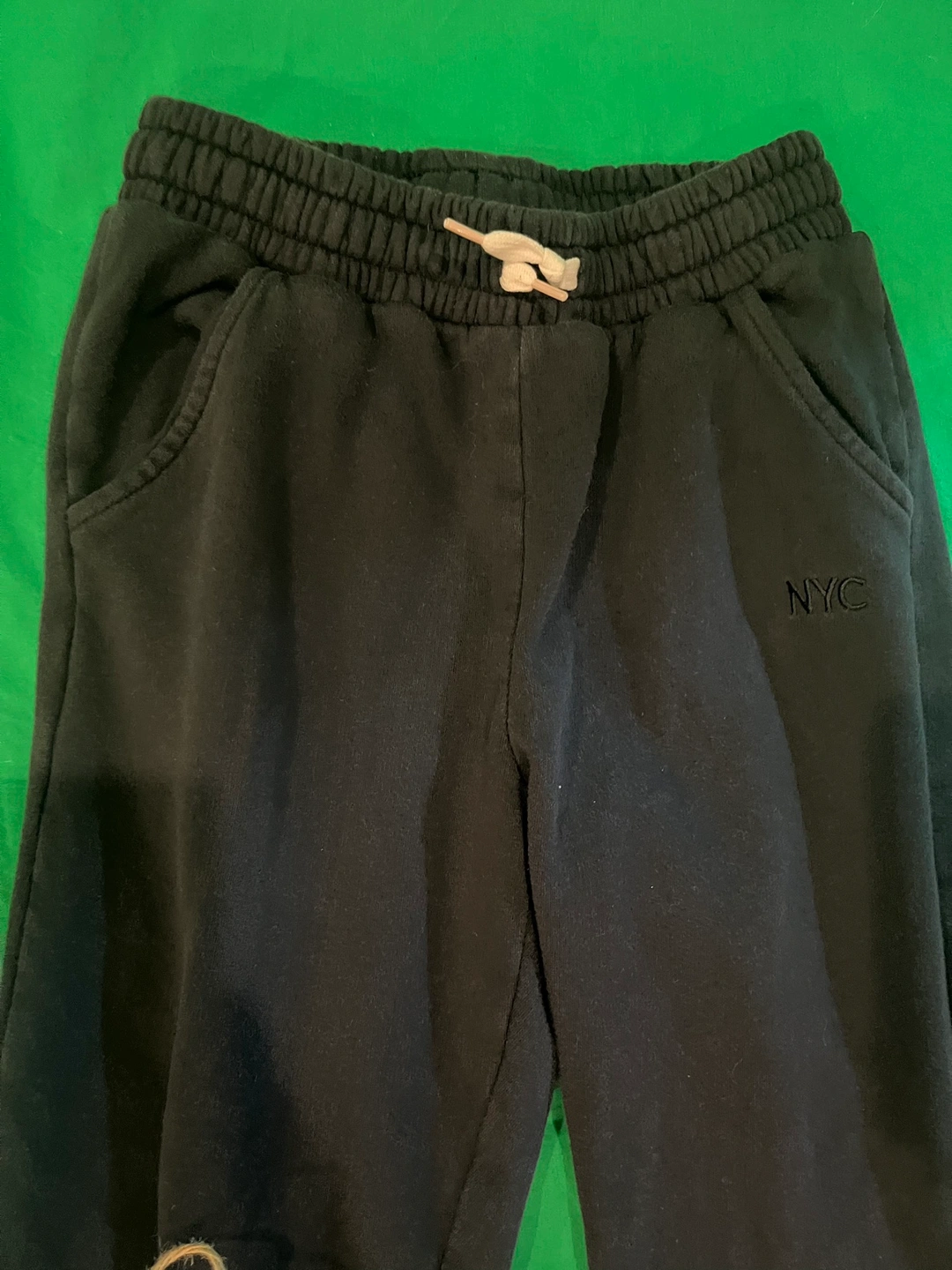 Black jogger pants with an elastic waistband and drawstring. They have two front pockets and "NYC" written on the right leg.