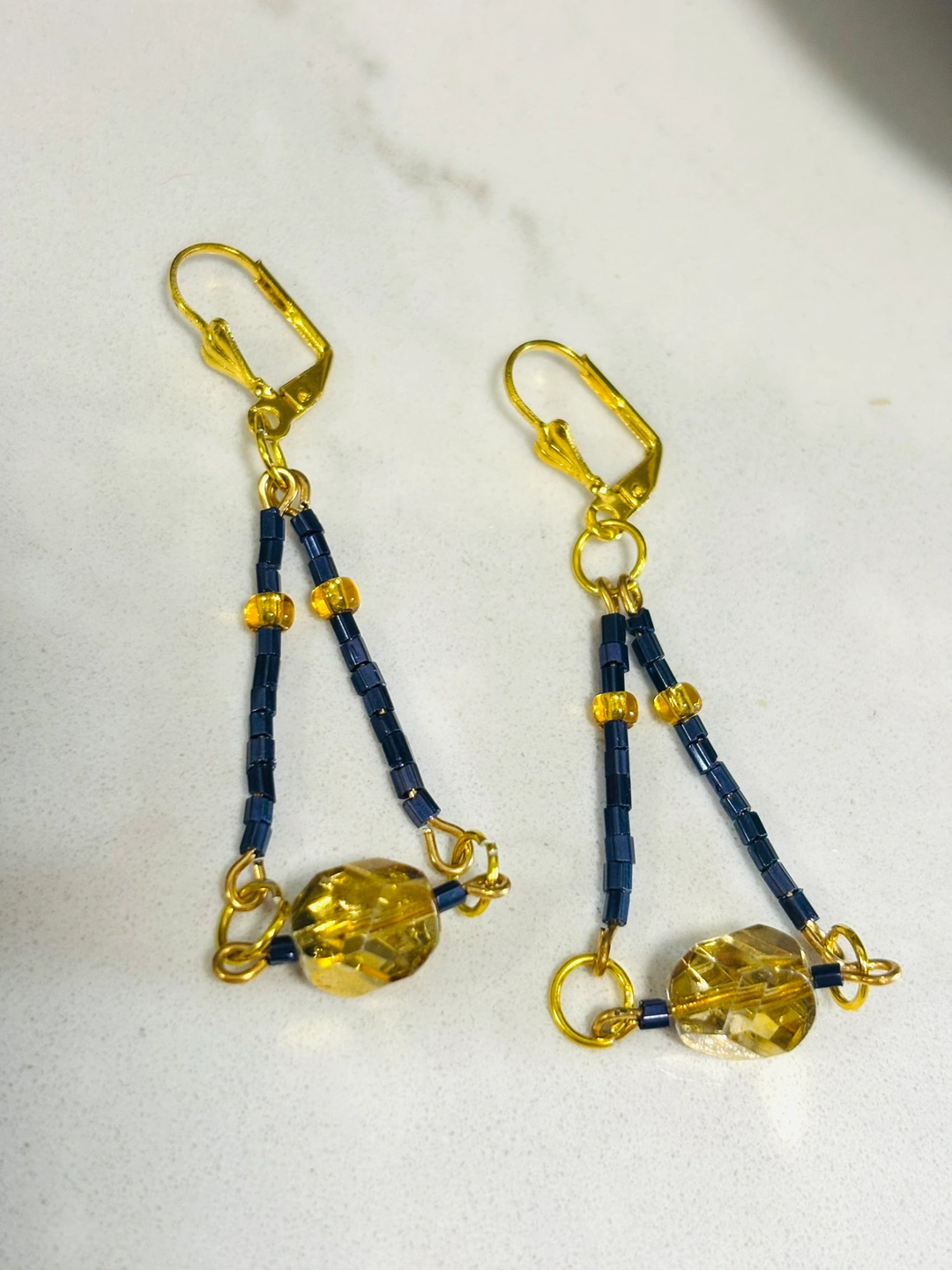 These are beautiful gold and blue earrings with gold hoops and a gold chain. The earrings have a large amber-colored crystal bead in the center of the gold chain and a small gold bead interspersed with blue beads. The earrings have leverback closures.