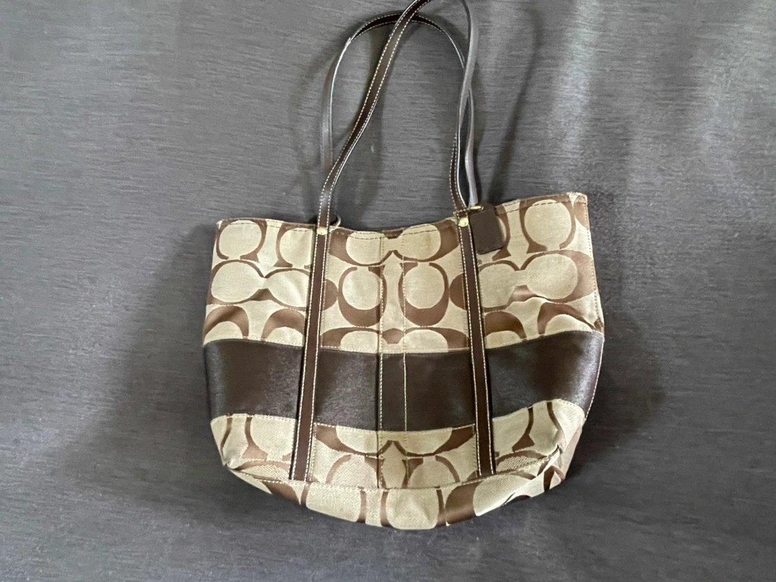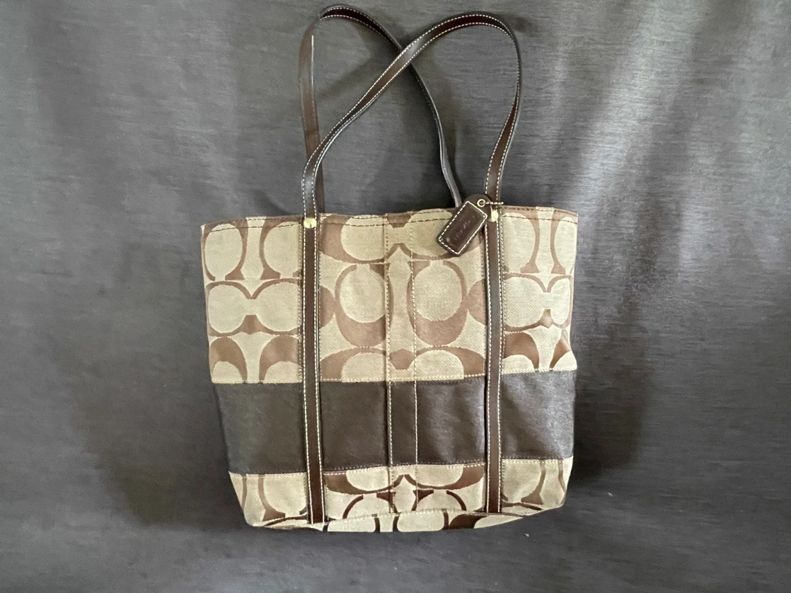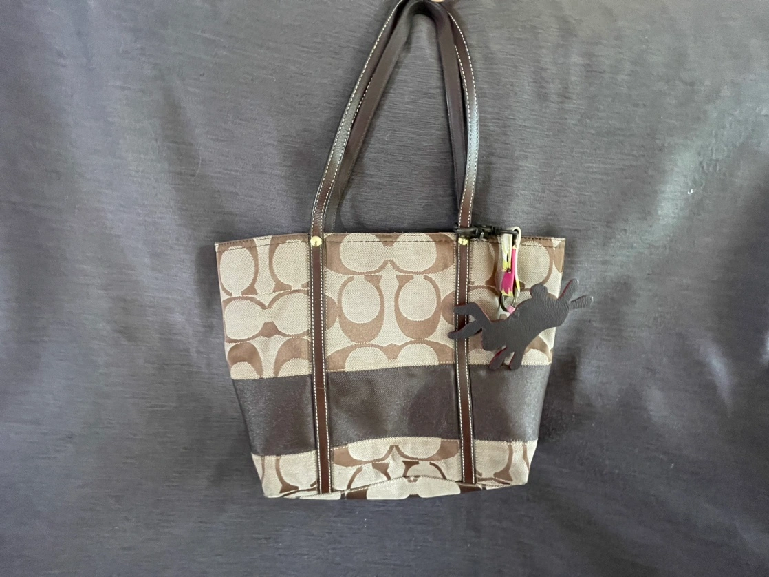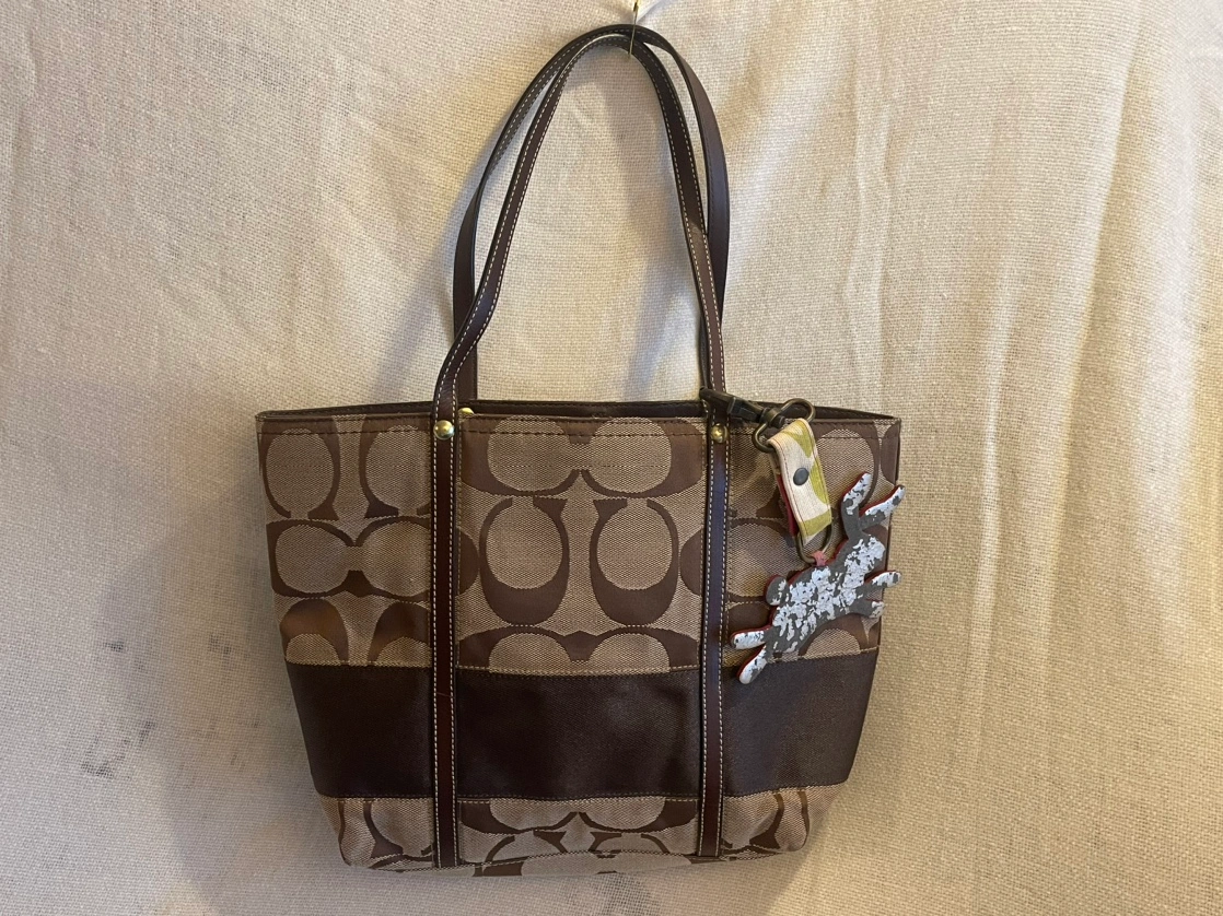 Brown Coach tote bag with a matching charm. The bag has a zipper closure. The Coach tag reads, "A19 E0768-11098".