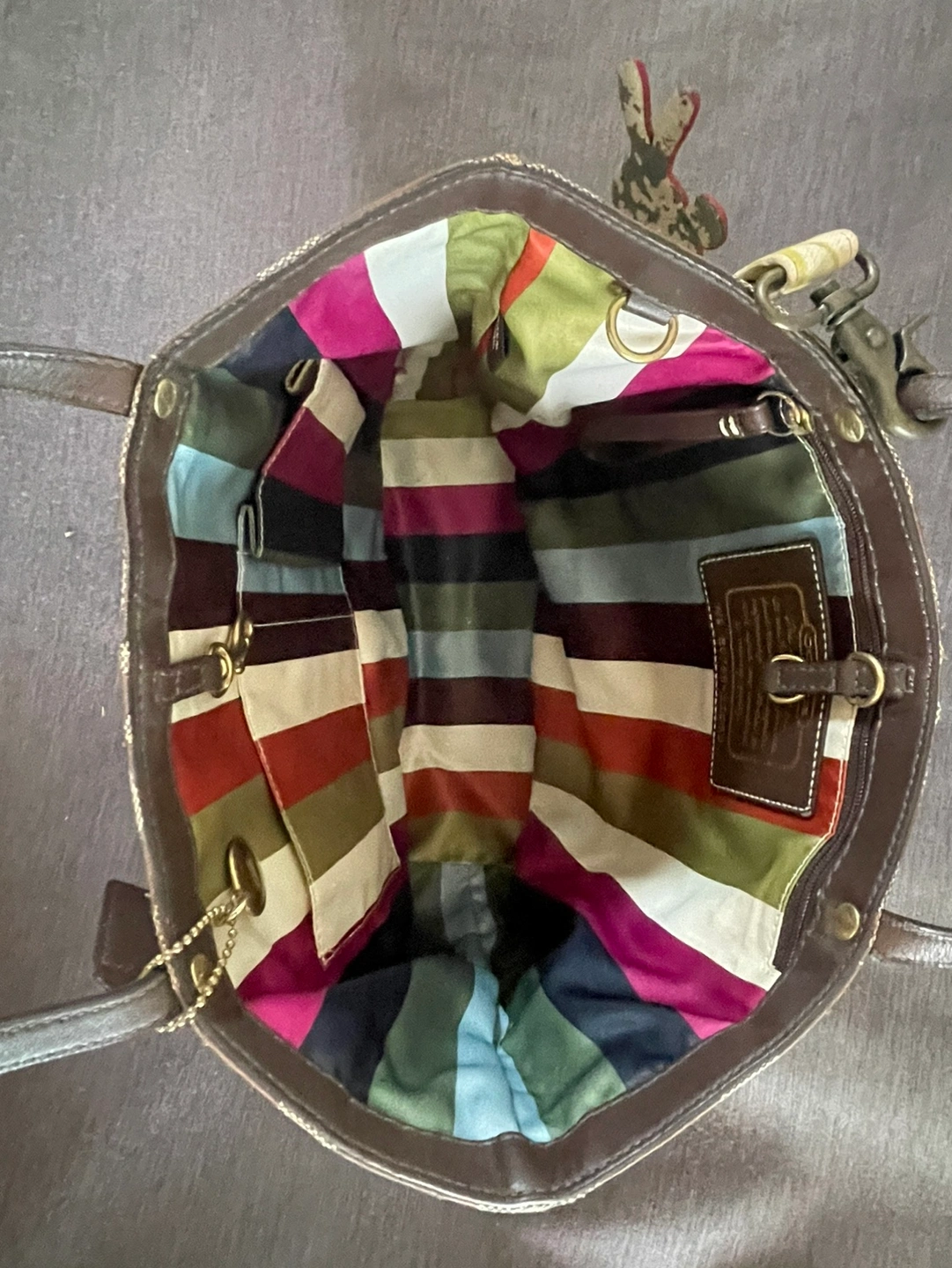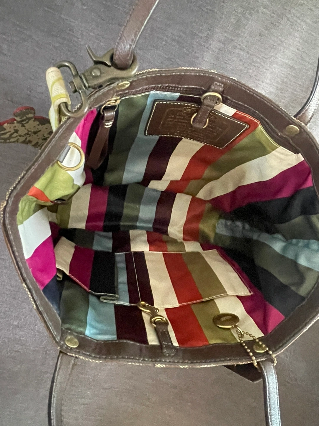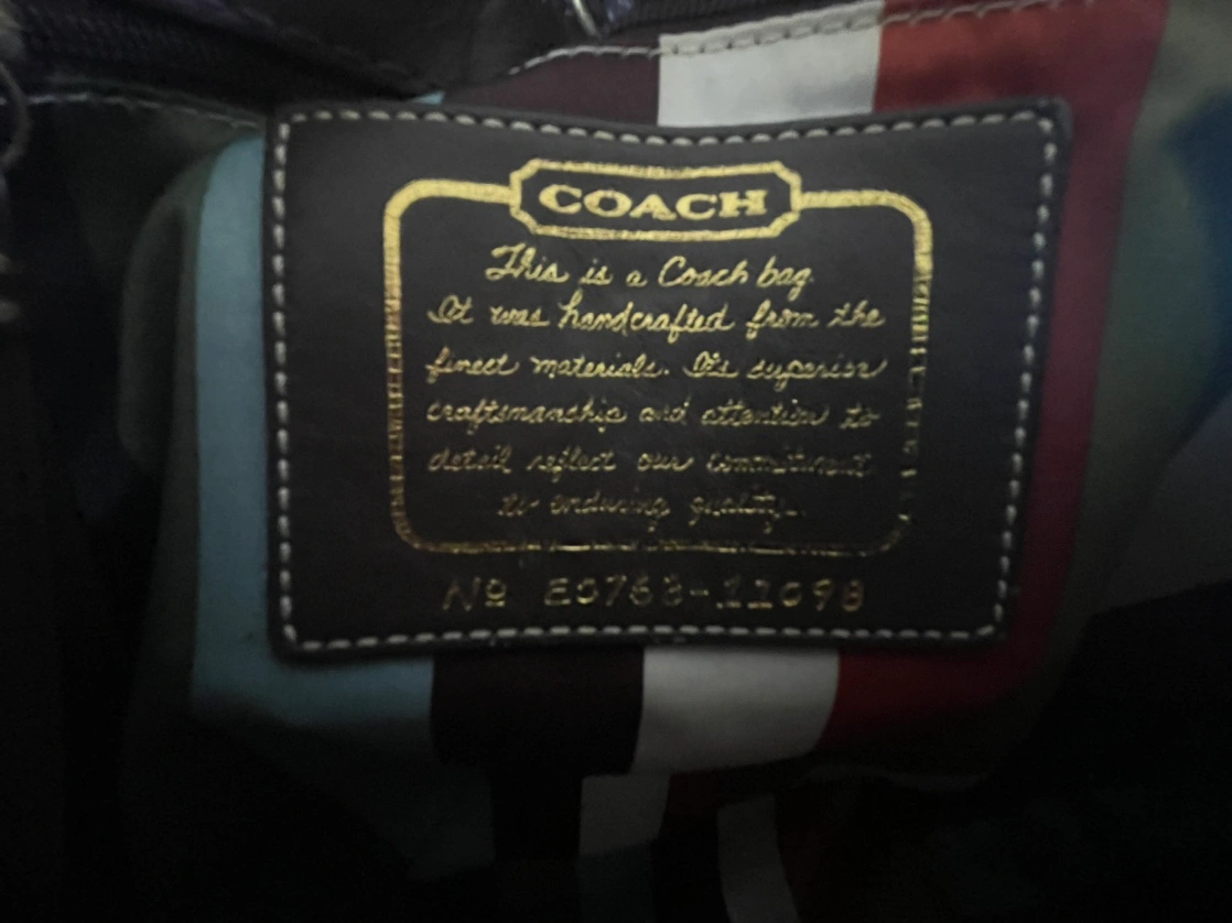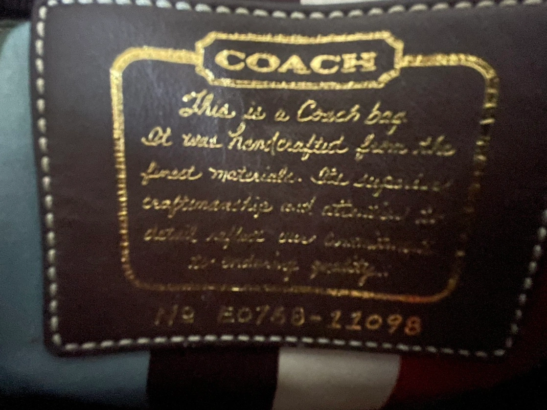 Brown Coach tote bag with a matching charm. The bag has a zipper closure. The Coach tag reads, "A19 E0768-11098".
