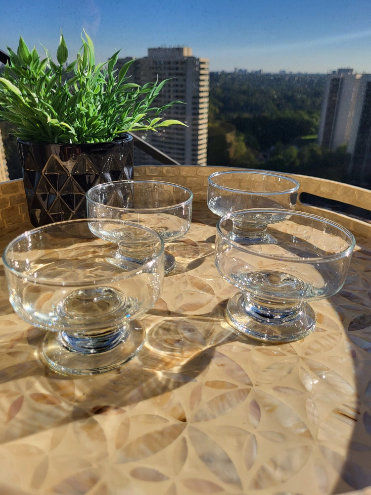 Set of 4 glass dessert bowls in excellent new condition. Perfect for serving ice cream, mousse, or other desserts.