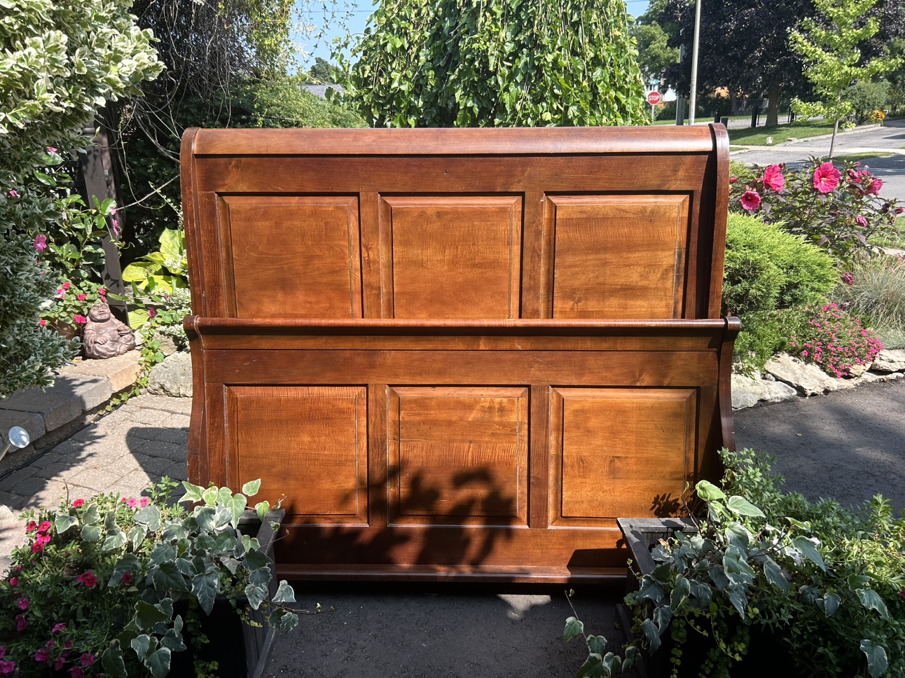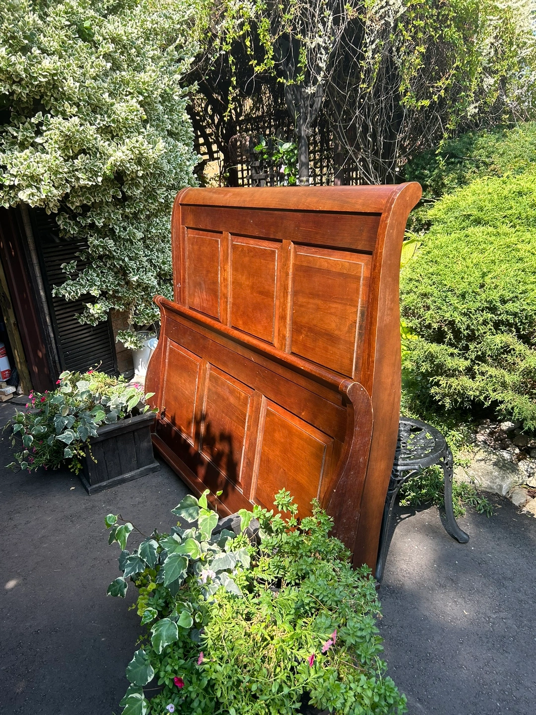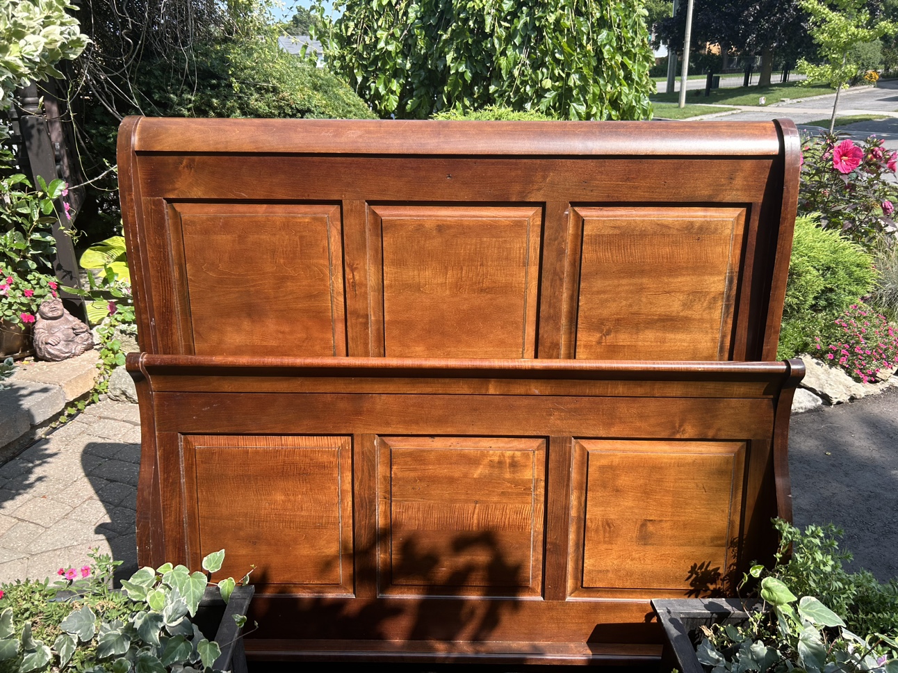 This is a beautiful solid wood sleigh bed frame. It is in good condition and ready for a new home. It is a queen size. Pick up only.