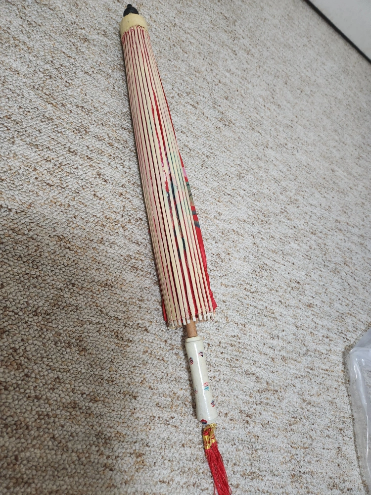 This is a red parasol with a floral pattern. It has a wooden handle. It is made of silk. It is about 36 inches in diameter. It is in good condition with no damage.