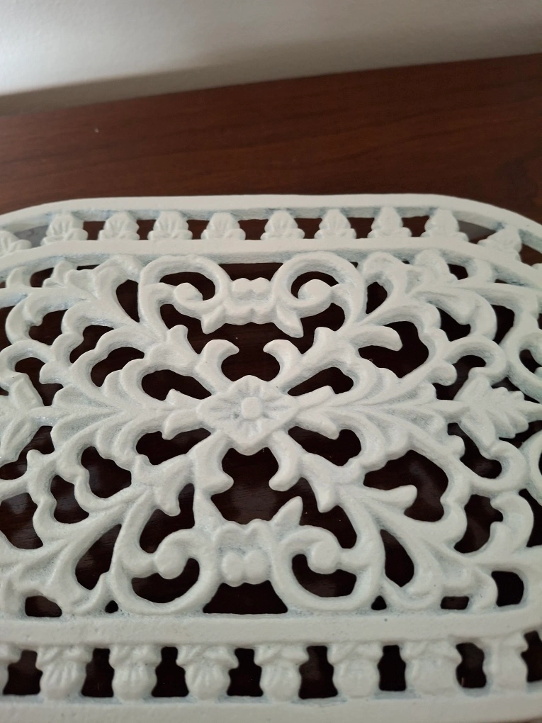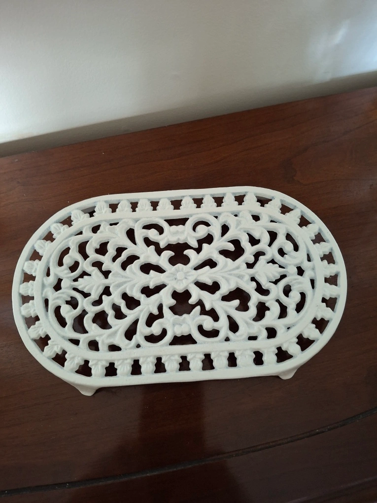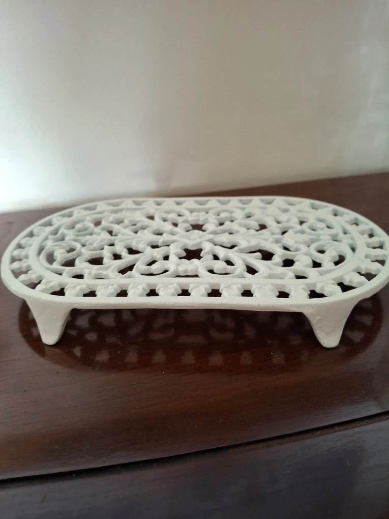 White iron trivet with feet. 8.25” by 5.25”. Good condition. Available for pickup in Markland Wood.