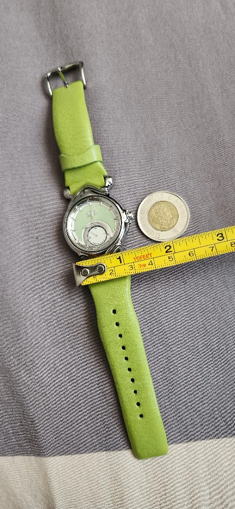 Green leather band with silver accents. The watch has a white face and green inner circle with a small second hand. The watch features a unique shape and design. The watch is approximately 6 cm in diameter. The band is approximately 20 cm long.