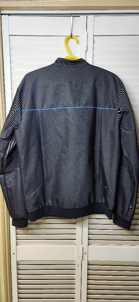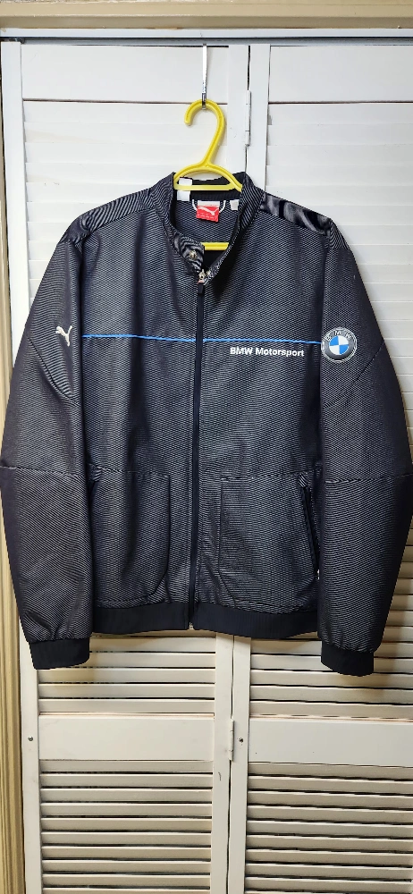 Black jacket with blue accents and BMW Motorsport logo.