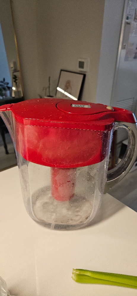 A water pitcher with a red lid and a clear body. It has a filter cartridge in the centre. It is in used condition.